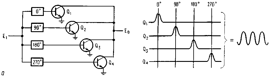 Ïðèíöèï ðàáîòû óìíîæèòåëåé òàêîãî òèïà ïîêàçàí íà ðèñ.1,à. ×àñòîòà ñèíóñîèäàëüíîãî ñèãíàëà óìíîæàåòñÿ íà N ïóòåì ðàçäåëåíèÿ âõîäíîãî íàïðÿæåíèÿ íà N ðàçëè÷íûõ ôàç, ðàâíîóäàëåííûõ äðóã îò äðóãà â äèàïàçîíå 360°. N ñèãíàëîâ ñ ðàçëè÷íûìè ôàçàìè óïðàâëÿþò N òðàíçèñòîðàìè, ðàáîòàþùèìè â ðåæèìå êëàññà Ñ, âûõîäíûå ñèãíàëû êîòîðûõ îáúåäèíÿþòñÿ äëÿ ôîðìèðîâàíèÿ èìïóëüñà ÷åðåç êàæäûå 360°/N ãðàäóñîâ. Áëàãîäàðÿ èñïîëüçîâàíèþ N òðàíçèñòîðîâ ìîùíîñòü âõîäíîãî ñèãíàëà ìîæåò áûòü â N ðàç âûøå ìîùíîñòè, íåîáõîäèìîé äëÿ íàñûùåíèÿ òðàíçèñòîðà.