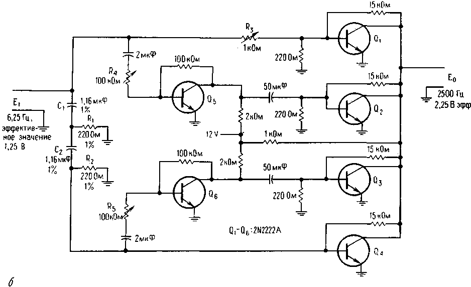 Îïèñûâàåìûé óìíîæèòåëü çâóêîâîé ÷àñòîòû íà 4 (ðèñ.1,á) ñîäåðæèò ÷àñòîòíî-çàâèñèìûå 90°-íûå ôàçîâðàùàòåëè R1C1 è R2C2. Òðàíçèñòîðû Q1 è Q4 ôîðìèðóþò èìïóëüñû, ñäâèíóòûå íà âûõîäå ïî ôàçå íà 0 è 90°. Ôàçîâàÿ èíâåðñèÿ èìïóëüñîâ îñóùåñòâëÿåòñÿ òðàíçèñòîðàìè Q5 è Q6, êîòîðûå óïðàâëÿþò òðàíçèñòîðàìè Q2 è Q3, â ðåçóëüòàòå ÷åãî íà âûõîäå ïîñëåäíèõ îáðàçóþòñÿ èìïóëüñû ñ ôàçîâûì ñäâèãîì 180 è 270°. Ñäâèíóòûå ïî ôàçå íà 90° âûõîäíûå èìïóëüñû îáúåäèíÿþòñÿ äëÿ ôîðìèðîâàíèÿ ó÷åòâåðåííîé ÷àñòîòû. Óìíîæèòåëü çâóêîâîãî äèàïàçîíà ó÷åòâåðÿåò ÷àñòîòû îò 625 äî 2500 Ãö.