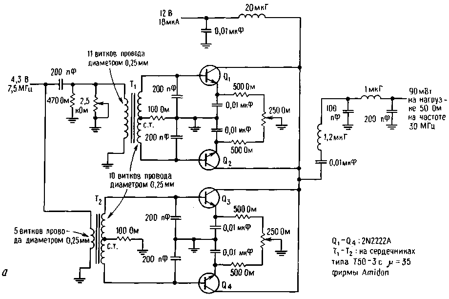 Èíäóêòèâíîñòü L îáðàçîâàíà ïåðâè÷íîé îáìîòêîé òðàíñôîðìàòîðà T1; ñ âòîðè÷íîé îáìîòêè íà òðàíçèñòîðû Q1 è Q2 ïîñòóïàþò ñèãíàëû, ñäâèíóòûå ñîîòâåòñòâåííî íà 90 è 270°. Ôàçîâûå ñäâèãè 0 è 180° îñóùåñòâëÿþòñÿ òðàíñôîðìàòîðîì Ò2, êîòîðûé ïîäêëþ÷åí ê òðàíçèñòîðàì Q3 è Q4.