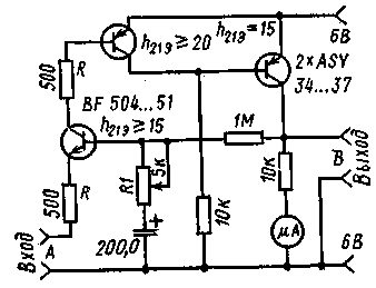 Чувствительность прибора ( рис.2) регулируется переменным резистором R1. К выходным зажимам, кроме гальванометра, можно подключить самописец. Можно также добавить операционный усилитель с реле или исполнительным механизмом, или подключить все устройство к входу радиотелеметрической системы. Резисторы R служат только для защиты транзисторов от перегрузки и при коротком замыкании на входе системы или в моменты включения электропитания. Прибор может найти и другое применение, например в технике при исследованиях процессов с омическим датчиком в диапазоне частот от тысячных долей герца до десятков килогерц. На досуге с прибором можно проводить забавные "измерения темперамента". На пальцах партнера и партнерши укрепляют пружинные металлические зажимы. В момент поцелуя отклоняется стрелка прибора, прикосновение к другому испытуемому даст иной результат. Интересно попытаться применить это устройство в качестве детектора лжи. Для этого металлические зажимы укрепляют на указательных пальцах партнера и задавая ему вопросы, следят за показаниями стрелочного прибора. Круг вопросов можно расширить, например: "Как тебя зовут?" "Где ты живешь?", "Пьешь ли ты вино"?, "Куришь ли?", "Что ты делал в субботу вечером?". Перед измерениями следует проводить установку нуля. Оба зажима при этом должны быть уже закреплены. Прибор желательно иметь с двусторонней шкалой. Литература