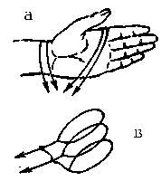 Два электрода (рис.3), которые имеют вид замкнутых петель из провода без изоляции, закрепляют на кисти руки или на запястье. В первом случае обеспечивается большая чувствительность, но при этом могут иметь место помехи, вызванные движениями кисти рук. Если это так, то электроды следует закрепить на запястье. Если чувствительность недостаточна, соедините между собой две-три петли параллельно. Петли прикрепляют на коже каучуковой или резиновой лентой или просто повязкой. Электроды можно закрепить и на стопе ноги.