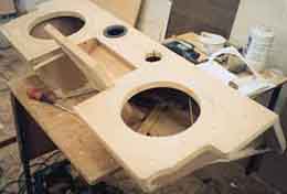 ЭНЦИКЛОПЕДИЯ РАДИОЭЛЕКТРОНИКИ И ЭЛЕКТРОТЕХНИКИ Изготовление сабвуферов, секреты мастеров. Энциклопедия радиоэлектроники и электротехники Энциклопедия радиоэлектроники и электротехники / Акустические системы Время пилить рояли Полноценная звукопередача сегодня немыслима без низкочастотной составляющей акустического сигнала. Поэтому все чаще водители, неравнодушные к качеству звука в автомобиле, дополняют стереомагнитолу и пару колонок (как сказал бы американский установщик, "deck and two") динамиками, расширяющими воспроизводимый звуковой диапазон как в сторону верхнего, так и в особенности нижнего предела. Поскольку сигнал в 20 Гц - 150 Гц не оказывает практического влияния на стереоэффект, принято выделять его в один канал, который оформляют одним акустическим корпусом, упрощая тем самым схемное решение и сохраняя пространство салона автомобиля. А благодаря тому, что звук в области басовых частот распространяется, огибая препятствия, размещать сабвуферный корпус можно в любой свободной части автомобиля. Акустический короб изготавливают из разных материалов: фанеры, ДСП, пластика. Есть и такие мастера, которые используют древесину от музыкальных инструментов. Акустическое оформление сабвуфера, если это не набор уже готовых деталей заводского изготовления, обычно включает: проектирование и расчет акустической системы для конкретного заказа, изготовление акустического корпуса и установку системы в автомобиль. Поскольку акустическое оформление сабвуферов требует творческого подхода, каждый мастер-установщик находит собственный ключ к его воплощению в жизнь. Согласовав с заказчиком принципиальные вопросы, мастер приступает к детальным расчетам будущей акустики. Десятки схем корпусов для сабвуферов можно свести к нескольким основным типам, среди которых наиболее известны закрытые, фазоинверсные системы и системы с пассивными динамиками. При конструировании сабвуферной акустической системы обычно стремятся получить хорошую передаточную функцию, то есть хорошее соотношение создаваемого ею звукового давления и комплексного входного сигнала. Передаточные функции трех упомянутых систем в принципе аналогичны передаточной функции фильтра верхних частот соответственно второго и четвертого порядка, с крутизной спада амплитудно-частотной характеристики в сторону низких частот 12 дБ на октаву и 24 дБ на октаву, а итоговая АЧХ в области рабочих частот сабвуфера зависит от характеристик используемого динамика, применяемого фильтра-кроссовера, конструкции и материала корпуса, а также возможностей усилителя мощности. Учитывая все эти особенности в акустическом оформлении сабвуфера, мастера стремятся уменьшить амплитуду смещения подвижной системы динамика и тем самым повысить уровень входной электрической мощности, а также максимального звукового давления, что поможет снизить его перегрузки и искажения сигнала. Для детальной проработки конструктивного исполнения сегодня можно пользоваться специальными компьютерными программами расчета, закладывая "на входе" параметры сабвуфера и получая "на выходе" рекомендуемые характеристики корпуса акустической системы. Иногда для расчета некоторых объемных характеристик корпуса мастеру-установщику приходится пользоваться и "эквивалентами": если изготовитель са