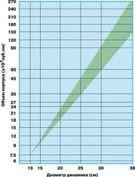 Оптимальный размер корпусов сабвуферов Системы этого типа обладают хорошими акустическими характеристиками при конструктивной простоте. Объем корпуса определяет пределы частотного диапазона, в котором установленный сабвуфер будет иметь оптимальные характеристики: если объем недостаточен для данного динамика, то давление внутри корпуса будет более высоким, чем снаружи, и наиболее низкие тона будут ослабляться. При дальнейшем уменьшении его объема потери низкочастотной составляющей будут возрастать, а более высокие тона, наоборот, подчеркиваться, усиливая "эффект бочки", вместо плотных и ясных басов. Поэтому при недостатке свободного пространства лучше использовать сабвуфер меньшего размера, например, 8-дюймовый, вместо того, чтобы максимально ограничивать корпус 10- или 15-дюймового динамика. Увеличение объема корпуса выше рекомендуемого изготовителем сабвуфера может повысить отдачу на самых низких частотах, однако мастер столкнется с еще большими проблемами при его установке в автомобиль. График сверху характеризует рекомендуемые оптимальные размеры корпусов для сабвуферов различного диаметра. Фазоинверсные системы В поисках более эффективных схем акустического оформления низкочастотных динамиков мастера уже десятилетия назад стали использовать корпуса с фазоинверторами и акустическими воздуховодами различного типа. Интерес к ним особенно возрос в последние годы, с развитием hi-fi-аппаратуры благодаря тому, что они позволяют расширить диапазон воспроизводимых частот. Некоторые мастера считают оправданным потратить дополнительные усилия на то, чтобы пойти дальше закрытой конструкции и получить выигрыш в отдаче на низких частотах. В фазоинверсных корпусах применяются цилиндрические или прямоугольные трубы, настраиваемые обычно на определенную частоту. Акустическое оформление сабвуфера с применением таких корпусов требует от мастера-установщика больших теоретических знаний и опыта, так как для получения хорошей передаточной функции приходится согласовывать, например, такие факторы, как взаимное влияние сопротивлений излучения диффузора и трубы фазоинвертора через взаимно соколеблющуюся массу воздуха. Ошибки, например, при расчетах добротности, а также конструировании и настройке фазоинвертора являются причиной того, что акустическая система "бубнит" или же бас "размазан". И даже если труба фазоинвертора настроена на необходимую частоту, она может стать источником нелинейных искажений, если, например, объемная скорость воздуха в ней превышает допустимую (она не должна превышать 5% от скорости звука): в этом случае поток воздуха становится турбулентным. Чувствительность передаточной функции (звукового давления) фазоинверсной системы к расстройке частоты фазоинвертора очень высока, и после окончательной сборки может возникать необходимость точной подстройки. Оценивая эффективность и качество звучания той или иной сабвуферной системы, специалисты-практики часто пользуются анализом уровня звукового давления, например, в третьоктавных полосах диапазона его рабочих частот. Для измерения этого уровня и других важных характеристик готовой сабвуферной системы можно пользоваться инструментами реальновременного анализа (см. "Мастер 12 Вольт" N 3 за 1997 год). Признается и законность субъективных о