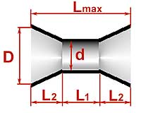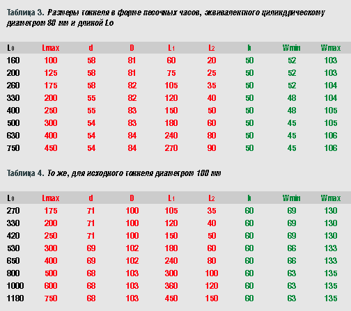 Таблица 2 составлена для исходного тоннеля диаметром 100 мм. Это подойдет для большинства сабвуферов с головкой диаметром 300 мм. Если решите пользоваться программой самостоятельно, помните: тоннель в форме усеченного конуса делается с углом наклона образующей a от 2 до 4 градусов. Этот угол больше 6 - 8 градусов делать не рекомендуется, в этом случае возможно возникновение завихрений и струйных шумов на входном (узком) конце тоннеля. Однако и при небольшой конусности уменьшение длины тоннеля получается довольно значительным. Тоннель в форме усеченного конуса не обязательно должен иметь круглое сечение. Как и обычный, цилиндрический, его иногда удобнее делать в виде щелевого. Даже, как правило, удобнее, ведь тогда он собирается из плоских деталей. Размеры щелевого варианта конического тоннеля приведены в следующих столбцах таблицы, а что эти размеры означают, показано на рис. 10. Замена обычного тоннеля коническим способна решить много проблем. Но не все. Иногда длина тоннеля получается настолько большой, что укорочения его даже на 30 - 35% недостаточно. Для таких тяжелых случаев есть... ...экстремальное решение для больших проблем Экстремальное решение заключается в применении тоннеля с экспоненциальными обводами, как показано на рис. 11. У такого тоннеля площадь сечения сначала плавно уменьшается, а потом так же плавно возрастает до максимальной. С точки зрения компактности для данной частоты настройки, устойчивости к струйным шумам и органным резонансам экспоненциальный тоннель не имеет себе равных. Но он не имеет себе равных и по сложности изготовления, даже если рассчитать его обводы по такому же принципу, как это было сделано в случае конического тоннеля. Для того чтобы преимуществами экспоненциального тоннеля все же можно было воспользоваться на практике, я придумал его модификацию: тоннель, который я назвал "песочные часы" (рис. 12). Тоннель-песочные часы состоит из цилиндрической секции и двух конических, откуда внешнее сходство с древним прибором для измерения времени. Такая геометрия позволяет укоротить тоннель по сравнению с исходным, постоянного сечения, по меньшей мере, в полтора раза, а то и больше. Для расчета песочных часов я тоже написал программу, ее можно найти там же, на сайте ACS. И так же, как для конического тоннеля, здесь приводится таблица с готовыми вариантами расчета.