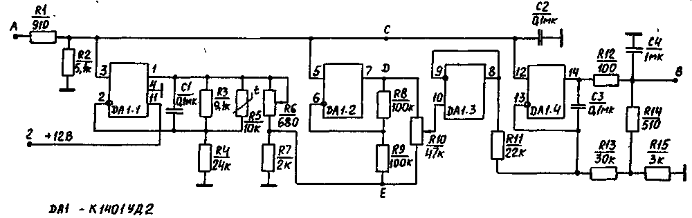 Принцип предлагаемого способа термокомпенсации состоит в том, что изменением напряжения питания варикапа VD1 добиваются ухода частоты, равного по величине, но противоположного по знаку уходу частоты ГПД, вызванному изменением температуры [2,3]. Так как рабочая частота трансивера RA3AO в режимах приема и передачи определяется, кроме ГПД, кварцевыми генераторами в узлах Л4, А7, Л 19, путем термокомпенсации суммарного ухода рабочей частоты всех генераторов трансивера одним предлагаемым устройством можно добиться повышения стабильности рабочей частоты трансивера в диапазоне температур от -10°С до +50°С. При повторении трансивера RA3AO из-за многообразия конструктивных особенностей, примененных материалов и разброса параметров комплектующих изделий величина и знак температурного ухода рабочей частоты могут иметь различные значения. В рассматриваемой ниже схеме термокомпенсации имеется возможность осуществить выбор знака и величины напряжения термокомпенсации. Экспериментальные кривые, иллюстрирующие уходы частоты трансивера при изменении температуры внутри корпуса от времени работы, приведены на рис. 2. Здесь кривая 1 показывает уход рабочей частоты трансивера без термокомпенсации, кривая 2 - уход частоты трансивера со схемой термокомпенсации, но недостаточно отрегулированной для получения необходимой стабильности частоты трансивера. Кривая 3 иллюстрирует минимальный уход рабочей частоты трансивера при оптимально выбранном режиме работы схемы термокомпенсации. Анализ кривых 1-3 (рис. 2) показывает, что с помощью узла термокомпенсации можно добиться уменьшения отклонения частоты трансивера, связанного с его самопрогревом, и свести нестабильность частоты трансивера к величине дрейфа при установившемся температурном режиме работы трансивера. Предложенная схема термокомпенсации обеспечивает нестабильность рабочей частоты трансивера не более 200 Гц в течение нескольких часов его работы. Необходимо отметить, что рассматриваемый узел термокомпенсации не уменьшает величину дрейфа рабочей частоты трансивера. Введение схемы термокомнснсации требует небольших затрат и незначительно усложняет схему трансивера RA3AO. Она также не приводит к изменению работы узла расстройкой частоты трансивера. Однако из-за изменений напряжения на варикапе VD1 при термокомпенсации происходит незначительное изменение величины диапазона расстройки частоты трансивера. Схема термокомпснсации может найти применение в любом устройстве, имеющем параметрическую стабилизацию частоты гетеродина. Схема узла термокомпенсации приведена на рис.3, а его включение в трансивер RA3AO показано на рис.1. Узел тсрмокомпснсации включается в разрыв (обозначенный точками А, В) цепи питания варикапа VD1 узла расстройки частоты трансивера. Узел тсрмокомнснсации сохраняет начальное напряжение в точке В, равное +8 В. Он выполнен на счетверенном операционном усилителе К 1401 УД 2Л (Б). В качестве термодатчика примечен терморезистор (R5), через который протекает стабильный ток, формируемый операционным усилителем DA1.1. Линеаризация температурной зависимости сопротивления резистора R5 в диапазоне температуры от минус 10°С до плюс 50°С осуществлена с помощью резистора R3. Терморезистор устанавливается на корпусе блоха ГПД трансивера. Изменение температуры блока ГПД приводит к
