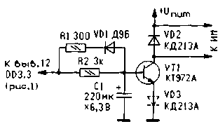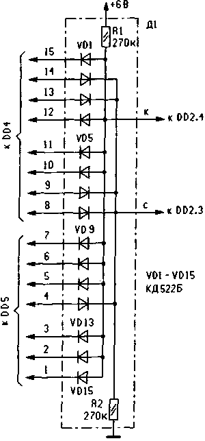 В сдвигающем регистре принятый сигнал (или помеха) фиксируется следующим образом. По фронту импульса первой же ИК вспышки микросхемы DD4-DD6 устанавливаются в нулевое состояние (на их выходах возникают нули) и счетчик DD6 начинает счет импульсов с частотой 32 768 Гц. Примерно через 0,5 мс (tзн/2) ноль на выходе 24 (выв. 5) счетчика DD6 будет замещен единицей. В сдвигающем регистре К561ИР2 такой перепад напряжения на входе С приводит к перемещению хранящегося в нем числа на один разряд в сторону старших (по схеме на рис. 1 - вниз), а в младший разряд микросхемы DD4 будет вписано то значение, которое в этот момент окажется на его входе D (выв. 7). Это может быть и 1 - расширенный до tф1 "единичный" импульс, и 0 - если вспышка в этом знакоместе кодовой посылки отсутствовала. Следующий сдвиг числа произойдет через tзн=0,976 мс - "шаг", который сохранится в дальнейшем. Система сделает лишь 16 поразрядных сдвигов (сдвигающие импульсы, генерируемые счетчиком DD6, иллюстрирует рис. 2,в) - с появлением сигнала высокого уровня (лог. 1) на выходе 29 счетчика DD6 и соответственно низкого (лог. 0) на входе DD2.2 (выв. 9), счетчик самозаблокируется и сохранит это состояние до очередного старта системы. Таким образом, принятая последовательность ИК вспышек преобразуется в число, хранящееся в регистре DD4DD5. Остается выяснить, является ли оно кодовым. Осуществляется это диодно-резисторным дешифратором Д1, схему которого (для того же кода 111011100111001) иллюстрирует рис. 3. Идея дешифрации проста. Все выходы регистра, на которых в соответствии с кодовой комбинацией должна быть 1, подключают к входам диодно-резисторного логического элемента И (VD1, VD4-VD6, VD9-VD11, VD13-VD15, R1), а выходы, на которых должен быть 0, - к входам диодно-резисторного логического элемента ИЛИ (VD2, VD3, VD7, VD8, VD12, R2). Если в регистре зафиксировано число-код, то на выходе элемента И дешифратора установится напряжение высокого уровня, а на выходе элемента ИЛИ - низкого. И только в этом случае на выходе ИК приемника возникнет сигнал 1. Это "единичное" его состояние продержится до тех пор, пока не будет нажата кнопка SB1 "Обнуление" (параллельно ей может быть включено несколько кнопок такого же назначения) или по каналу не пройдет какой-либо посторонний сигнал.