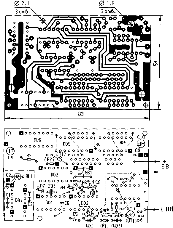 Все его детали ИК приемника смонтированы на печатной плате размерами 83х54 мм (рис. 4), выполненной из двустороннего фольгированного стеклотекстолита толщиной 1,5 мм. Технология изготовления самой печатной платы и приемы монтажа деталей на ней - те же, что и при конструировании брелока-генератора. Особое внимание при монтаже приемника следует обратить на экранирование фотоголовки (BL1, DA1 и др.): обладая высокой чувствительностью и значительной широкополосностью, она подвержена воздействию электрических сигналов различного происхождения. Экран в виде открытой плоской коробки размерами 30х15х11 мм (на рис. 5 он обозначен штриховыми линиями) изготавливают из жести по чертежу, показанному на рис. 6, и припаивают в двух-трех точках к фольге общего провода. При необходимости чувствительность фотоголовки можно уменьшить, зашунтировав вход микросхемы DA1 резистором R1 сопротивлением 0,2...3 МОм. Все резисторы - МЛТ-0,125. Конденсатор С2 - К53-30, С4 и С10 - импортные 0 8 мм, остальные - КМ-6, К10-176, КД. Кварцевый резонатор ZQ1 - малогабаритный часовой. На плате предусмотрено место (на рис. 5 обведено штрихпунктир-ной линией) для размещения и монтажа деталей звукового генератора, описанного в "Радио", 1997, № 8, с. 44, 45. Для ослабления засветки фотодиода посторонними источниками света, способными существенно уменьшить чувствительность приемника, его помещают в "колодец", склеенный из черного полистирола. Это защитит фотодиод от воздействия источников, расположенных в стороне от оптической оси. К тому же образующийся невидимый "коридор", в пределах которого только и будет возможен оптический контакт приемника с излучателем, умножит и без того немалые трудности информационного "взлома" системы. Окно фотодиода полезно заклеить пленкой, ослабляющей по преимуществу видимый свет. В роли такого своеобразного инфракрасного фильтра неплохо показали себя темные пластиковые обои. Тем более, что расстояние, на котором приемник способен обнаружить и дешифровать ИК вспышки брелока-излучателя, в среднем превышает 10 м. Приемник сохраняет работоспособность при снижении напряжения питания до 4 В, потребляемый им ток не превышает 1,4 мА. К выходу приемника (вывод 12 элемента DD3.6) могут быть подключены самые разные сигнальные устройства. Например, светодиод HL1 с токоограни-чительным резистором R9, показанный на рис. 1 штриховыми линиями, или упомянутый выше звуковой генератор, оповещающий о появлении "своего". Но если по сигналу приемника охранная система должна включить, скажем, привод дверного электрозамка, в сигнал, управляющий исполнительным механизмом (ИМ), нужно ввести временную задержку. Схема возможного ее варианта показана на рис. 5. Запаздывание срабатывания ИМ зависит от постоянной времени R2C1 и может составить несколько десятых долей секунды.