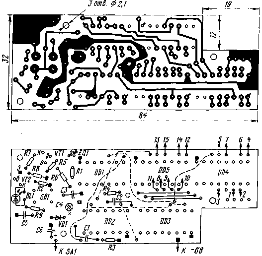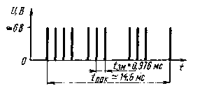 Детали генератора монтируют на печатной плате (рис. 2), изготовленной из двустороннего фольгированного стеклотекстолита толщиной 1,2...1,5 мм. Фольгу со стороны деталей не удаляют - ее используют в качестве общего "заземленного" проводника цепей устройства. В местах пропуска монтажных проводников или выводов деталей через отверстия в плате в ней делают выборки-кружки диаметром 1,5...2 мм (на рис. 2 не показаны). Места пайки к фольге выводов резисторов, конденсаторов и других деталей обозначены зачерненными квадратиками: место соединения с ней фрагмента печатного монтажа (проволочной перемычкой) отмечено квадратиком со светлой точкой посередине. Для пропуска выводов оксидного конденсатора С4 в плате просверлено отверстие диаметром 2,5 мм; диаметр вытравленного в фольге защитного кружка здесь должен быть больше -3...3.5 мм. Монтажную плату устанавливают на переднюю панель-обойму, склеенную из ударопрочного полистирола. Ее опорами служат приклеенные к панели три полистироловых столбика высотой по 8,5 мм с запрессованными в них металлическими вкладышами-гайками (резьбы М2). Батарея питания во избежание последствий возможной разгерметизации установлена в специальном отсеке. Выключатель питания SA1 (ПД9-1) размещен на передней панели. Кнопка SB1 (ПКн-159 или близкая ей по габаритам) должна иметь привод длиной 6...8 мм - достаточный для его вывода сквозь отверстие в передней панели. Корпус в виде открытой коробки размерами 88х37х16 мм, в который устанавливают полностью смонтированную панель и батарею питания, склеивают из ударопрочного полистирола толщиной 1,5 мм. В стенке корпуса против ИК диода просверлено отверстие диаметром 5...6 мм, которое (во избежание попадания мусора) можно заклеить тонким пластиком. Однако стенку можно и не сверлить - мощность ИК вспышек генератора способна "пробить" 1,5...2 мм полистирола, но его "дальнобойность" в таком случае существенно уменьшится. В кодовом излучателе можно использовать практически любые ИК диоды, ограничения -лишь габаритные: высота деталей, устанавливаемых на печатную плату, не должна превышать 8 мм. Все резисторы - МЛТ-0,125. Конденсатор С4 -оксидный К50-16. Конденсатор С6 (CE-DS Маrсоn) смонтирован параллельно плате, его номинальное напряжение должно соответствовать напряжению источника питания. Другие конденсаторы - КМ-5, КМ-6, К10-17Б. Правильно собранный генератор налаживания не требует. Проконтролировать же его работу можно с помощью осциллографа, подключенного к коллектору транзистора VT1. После включения питания и нажатия кнопки SB1 на экране осциллографа (время ждущей развертки - 20.. .30 мс) должна возникнуть и исчезнуть последовательность импульсов, разнесенных во времени в соответствии с закоммутированным кодом. Так, например, коду 111011100111001 будет соответствовать осциллограмма, изображенная на рис. 3 ("лишний" импульс в начале пакета - стартовый). По амплитуде импульсов, измеренных на резисторе R9, можно судить о токе в ИК диоде (Iимп (А) = Uимп (В) / R9 (Ом)), а в быстрой развертке (20...50 мкс, тоже ждущей) - об их форме и длительности, которая должна быть в пределах 5...15 мкс.