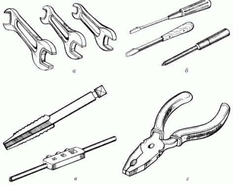 Инструментарий электрика. Энциклопедия радиоэлектроники и электротехники Энциклопедия радиоэлектроники и электротехники / Инструмент электрика Начинать любое дело положено с формирования набора инструментов, приспособлений и приборов, которые могут потребоваться при производстве работ. Не являются исключением и электротехнические работы: прокладка проводки, выявление причин возникших неисправностей, ремонт электроприборов. Для проведения электротехнических работ необходим набор стандартных инструментов и несколько простейших приспособлений (самодельных и промышленного образца). Это ручные инструменты общего назначения (рис. 1): набор гаечных ключей, комплект отверток, пассатижи, метчики и плашки относительно небольших размеров (от М2 до М6), вороток для метчиков и плашкодержатель, сверла по металлу от 1 до 10 мм (среди них должны быть и сверла с твердосплавными - победитовыми - напайками), ножовка по металлу, напильники, небольшие тиски, пинцет, зубило и шлямбур, молоток, монтажный нож, ножницы, боковые кусачки (бокорезы).
