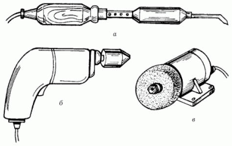 Для пробивания в стенах канавок и гнезд под провода, выключатели и розетки, кроме зубила, шлямбура и сверл, понадобится молоток. Далее следуют электроинструменты (рис. 2): электрический паяльник с комплектом расходных материалов (припой, флюс), электродрель, электроточило.