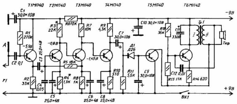 Действие прибора основано на регистрации электрического поля, которое образуется вокруг проводника (провода), находящегося под напряжением. Мощность прибора позволяет зарегистрировать ток частотой 50 Гц на расстоянии 6-8 см от проводника. Такое устройство можно приобрести в готовом виде или попытаться собрать по нижеследующему описанию. Для сборки прибора и обнаружения неисправности в скрытой электропроводке необходимы следующие комплектующие: четырехкаскадный усилитель звуковой частоты с коэффициентом усиления 3000-5000 единиц, выпрямитель, ключевой каскад, генератор звуковой частоты на 900-1600 Гц, две батареи 3336Л, трансформатор, антенна и головные телефоны (наушники). Для питания устройства осуществляют последовательное соединение батарей 3336Л (их суммарный ток - 5¬8 мА). Проводник с током в антенне А наводит в приборе напряжение частотой 50 Гц, которое увеличивается усилителем звуковой частоты (собранным на транзисторах Т1- Т4). Далее напряжение выпрямляется диодом Д1 (его значение на выходе - 0,2-0,4 В) и поступает на базу транзистора Т5 ключевого каскада. Под действием напряжения блокинг-генератор, собранный на транзисторе Т6, начинает генерировать колебания звуковой частоты, которые отчетливо слышны в головных телефонах, соединенных с генератором. Все детали прибора, кроме выключателя ВК1, батарей питания, гнезд Г1 и телефонов, размещают на гетинаксовой плате размером 12 x 7,2 см. Саму плату вместе с батареями, гнездами и тумблером выключателя помещают внутрь металлического корпуса размером 15 x 7,8 x 4,5 мм. Антенна А размером 13 x 6,5 см, изготовленная из листовой медной фольги, укрепляется в окне крышки корпуса на изолирующей гетинаксовой плате. Для нормальной работы прибора статический коэффициент усиления по току (Вст) всех транзисторов прибора должен быть в интервале 35-50. Трансформатор Тр1, монтируемый в прибор, изготавливают на магнитопроводе Ш5 x 6. Первичная обмотка трансформатора (I) должна состоять из 1500 витков провода ПЭВ диаметром 0,1 мм, вторичная обмотка (II) - из 600 витков такого же провода. После установки трансформатора следует проверить работоспособность блокинг-генератора, для чего коллектор и эмиттер транзистора Т5 временно замыкают накоротко проволочной перемычкой: при правильном подключении выводов обмотки (I) трансформатора Тр1 генератор начинает работать, в противном случае выводы нужно поменять местами. Ключевой каскад приводят в рабочее состояние подачей на базу транзистора Т5 отрицательного напряжения 0,2-0,4 Вт, которое снимается с делителя. Делитель составляют из постоянных резисторов сопротивлением 5,1 кОм и 150 Ом, включенных в общую цепь питания (если в качестве резистора R2 в схеме использовать переменное сопротивление, прибор будет более чувствителен). Напряжение питания блокинг-генератора при наладке ключевого каскада должно составлять 7-8 В. Налаживание самого усилителя звуковой частоты производят путем подбора сопротивления резистора R3, от которого зависят режимы работы транзисторов Т2- Т4. После сборки и наладки всех составляющих и самого прибора в целом можно приступать к определению места повреждения скрытой проводки (проходя по ее трассе). В цепь, трассу, место неисправности которой предстоит определить, подают напряжение; к прибору подсоединяют головные телефоны и включают его питание. Звуковой сигнал