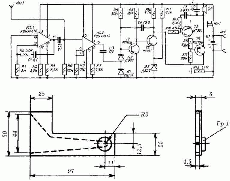 Питание сигнализатора напряжения осуществляют от аккумулятора напряжением 9 В; потребляемый ток в режиме индикации - 15 мА, при отсутствии сигнала - 5 мА. Масса прибора - 250 г; размеры - 10 x 5 x 3 мм. В основе электрометрического усилителя использована интегральная микросхема МС2 - повторитель напряжения с полевым транзистором на входе. Его чувствительность зависит от сопротивления R6, при необходимости ее можно регулировать в небольших пределах резистором R5 (при недостаточной чувствительности сопротивление резистора R5 уменьшают, при слишком большой - увеличивают). Выпрямитель на диодах Д1 и Д2 и одновиоратор на транзисторах Т1 и Т2, порог сраоатывания которого задан диодом Д3, образуют блок дискриминатора и расширения импульсов. Блок звуковой сигнализации монтируют по схеме мультивибратора на транзисторах Т3 и Т4. Коллекторная цепь транзистора Т4 включает электромагнитный капсюль Гр1 типа ДЭМШ или ТМ-2А. Схема несимметричного мультивибратора на интегральной микросхеме МС1 лежит в основе блока контроля исправности. Мультивибратор формирует короткие импульсы, частоту следования которых определяет емкость конденсатора С1. Когда импульсы через конденсатор С2 поступают на антенну Ан1 с частотой около 0,2 Гц, прибор срабатывает и сигнализатор подает одиночный звуковой сигнал длительностью менее 0,1 с; сигнал является свидетельством исправности сигнализатора напряжения. Если сигнализатор напряжения внести в электрическое поле, в антенне будет наведена электродвижущая сила (ЭДС), которая поступит на вход усилителя. Далее переменная составляющая тока через конденсатор С3 будет подана на дискриминатор. Чтобы одновибратор запустился и блок звуковой сигнализации начал генерировать звуковой сигнал, ток в сигнализаторе должен достигнуть заданного уровня (ток зависит от расстояния между антенной и токоведущими деталями электроустановки: чем меньше расстояние, тем больше сила тока). В качестве основы для монтажа сигнализатора напряжения используют печатную плату, которую вместе с аккумулятором размещают в металлическом корпусе; торцевые стенки корпуса должны быть выполнены из изоляционного материала. Одна из этих стенок выполняет роль антенны, поэтому ее изготавливают из фольгированного гетинакса (с части поверхности гетинакса фольга удаляется). Размеры антенны корректируют при настройке прибора. Во вторую торцевую стенку монтируют кнопку включения сигнализатора и гнезда разъема Ш1 для подключения зарядного устройства. Камеру акустического резонатора соединяют с электромагнитным капсюлем Гр1. Наладка сигнализатора напряжения заключается в регулировке порога срабатывания по напряженности электрического поля: - в первую очередь проверяют потребляемый ток при отсутствии звукового сигнала, он не должен быть больше 6 мА; - далее коллектор и эмиттер транзистора Т2 замыкают накоротко, при этом должен появиться звуковой сигнал; при отсутствии сигнала проверяют мультивибратор на микросхеме МС1; - затем сигнализатор постепенно приближают на допустимое правилами техники безопасности расстояние к токонесущему проводу; о срабатывании прибора свидетельствует звуковой сигнал. Отрегулированный должным образом сигнализатор позволяет регистрировать переменное напряжение 220/380 В на расстоянии 5-10 см. Как и при работе с ранее описанным пр
