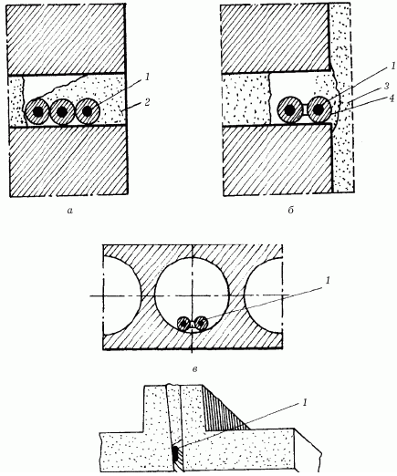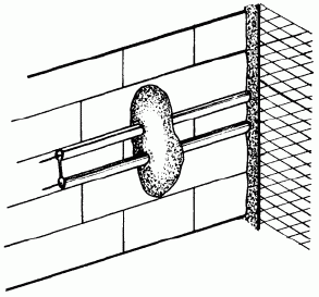 До заштукатуривания провода закрепляют временно в отдельных местах "примораживанием" при помощи алебастрового раствора (рис. 39) расстояние между точками "примораживания" не более 25 см .