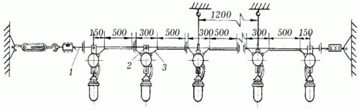 В качестве несущих тросов применяются стальные канаты-тросы диаметром 1,95-6,5 мм, сплетенные из стальных оцинкованных проволок. Допускается вместо несущего троса применять стальную оцинкованную или имеющую лакокрасочное покрытие горячекатаную проволоку (катанку) диаметром 5-8 мм. При подвеске трос должен быть хорошо натянут. Усилие при натяжении не должно превышать 0,7 того усилия, которое допускается для данного несущего троса. Работы по подводке и натяжке несущих тросов лучше всего вести при температуре окружающей среды не ниже 20 °C. При подвеске незащищенных изолированных проводов на тросах расстояние между точками крепления проводов не должно превышать: - для незащищенных изолированных проводов, проложенных на тросовых подвесках, при сечении 2,5-6 мм2- 1,5 м; - для проводов, проложенных непосредственно, при сечении 2,5-6 мм2- 0,5 м; - для кабелей во всех случаях - 0,5 м. Для натяжения стальных канатов при тросовой проводке используются муфты натяжные типа К798, К804, К805, а для натяжения стальных канатов или стальной проволоки при монтаже тросовых электропроводок - муфты типа МН. Допустимая нагрузка при натяжении не должна превышать 3 кН. Для концевого крепления стальных канатов или стальной проволоки диаметром 6-8 мм при монтаже тросовых электропроводок применяется анкер типа К675. Допустимая нагрузка на него не должна превышать 16 кН. Для крепления стальных канатов или проволоки к стенам используется анкер проходной типа К809 при усилии натяжения не более 16 кН. Для соединения проволочных подвесов, растяжек, оттяжек с несущим тросом электропроводки служит зажим типа К296. Допустимая нагрузка на него не должна превышать 7,2 кН. Для скрепления петли, выполняемой на конце стального троса (каната), диаметром 6-8 мм служит зажим тросовый типа К676. Допустимая нагрузка на зажим составляет 16 кН. Для ответвления проводов от магистрали, а также для присоединения светильников при тросовой электропроводке используются коробки тросовые типа У245, У246, снабженные винтом для заземления (присоединения нулевого провода сети), и коробки типа У230, У231, применяемые для ответвления от тросовых электропроводок, выполненных проводами APT, ABTB (к одной коробке может быть присоединено до трех электроприемников). Коробки ответвительные типа У257 используются для выполнения разъемных присоединений светильников к магистральной осветительной сети. Коробка снабжена трехполюсной розеткой. Автор: Коршевр Н.Г.