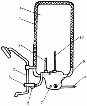 Концы спирали подключены к стержням, которые выходят из герметически закрытой трубки и служат контактами для подключения ТЭНа к сети. Во избежание замыкания спирали на корпус трубки последнюю наполняют сыпучим изолятором, хорошо проводящим тепло и абсолютно не проводящим электрический ток (кварцевым песком или кристаллической окисью магния - так называемым периклазом). Заполняющий трубку изолятор под большим давлением превращается в монолит, поэтому он не только выполняет изоляционную функцию, но и надежно фиксирует спираль по оси трубки. ТЭН - достаточно универсальный прибор, предназначенный для использования в различных водонагревательных устройствах. Поэтому в зависимости от назначения ТЭНы изготавливаются из различных материалов (в том числе и тугоплавких) и всевозможных форм (после опрессовки трубку можно изгибать любым образом). Температура рабочей поверхности ТЭНов имеет достаточно широкий диапазон: от 450 °C (для бытовых электронагревательных приборов) до 800 ° C (для нагрева жиров, масел, легкоплавких металлов в промышленных установках). Средний срок службы ТЭНов при правильной эксплуатации - до 10 000 часов непрерывной работы. Поскольку, как уже было сказано, существует большое количество видов ТЭНов, при их покупке следует особое внимание обращать на маркировку, где указаны не только метрические параметры его элементов, но и номинальная мощность в кВт и напряжение в В, материал трубки, среда, для которой ТЭН предназначен, а также вид климатического исполнения по ГОСТу. Среди недостатков ТЭНов следует отметить их высокую металлоемкость, использование в них дорогостоящих материалов (нихрома, нержавеющей стали) и, как следствие, большую стоимость. Кроме того, ремонту ТЭНы не подлежат. Простейшим бытовым водонагревательным прибором, в котором используется ТЭН, является электрокипятильник; по сути, кипятильник - это ТЭН с ручкой и шнуром. Ручка кипятильника имеет крюк (или сама выполнена в виде крюка), благодаря чему кипятильник укрепляют на краю емкости, в которой нагревается вода. Всевозможные электрические чайники, самовары, кофейники представляют собой емкости для нагрева воды, в нижнюю часть которых вмонтирован ТЭН той или иной формы. При устройстве на дачном участке горячего душа зачастую используют аккумуляционные водонагреватели низкого давления (типа ЭВАН) все с тем же трубчатым нагревательным элементом мощностью до 1,24 кВт. Схема его подключения к водопроводной трубе и разбрызгивателю душа показана на рис. 93.