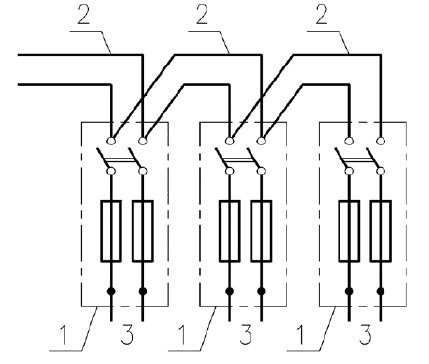 В строительстве часто применяют ящики ЯВП2-60 и ЯРВМ-6122. Можно применять и другие ящики аналогичной конструкции, например типа ЯРП11-302 или ЯБПВУ-1м. Выпускаются ящики для эксплуатации при температуре воздуха от -40 до +45 °C или от -10 до +40 °C. Ящики монтируют на стене с наружной стороны дома в вертикальном положении, рукоятка рубильника располагается обычно справа. Допускается отклонение ящика от рабочего положения до 5° в любую сторону. Обычно конструкция ящиков обеспечивает блокировку рубильника с крышкой таким образом, что при включенном рубильнике крышку невозможно открыть, а при открытой крышке рубильник невозможно включить без нарушения блокировки. Ящики допускают ввод и присоединение сверху или снизу бронированных и небронированных кабелей и проводов в трубах с алюминиевыми или медными жилами с резиновой или пластмассовой изоляцией с сечением жил до 50 мм на фазу при номинальном токе 100 А. При присоединении построек к электрической сети в цепочку (рис. 17) ящик соединяют следующим образом: к вводным зажимам рубильника присоединяют по два провода. Сечение проводника, присоединяемого от первого ящика к последующему, составляет не более половины сечения проводника, присоединенного к первому ящику со стороны сети.