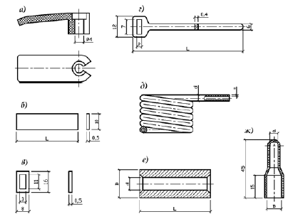 Металлические крюки изолируют, надевая на них поливинилхлоридную трубку. Крюки, вкручиваемые в деревянные перекрытия, изолировать не надо. Крюк КН-16 (из стали) применяют при устройстве вводов в здание. На штыревом конце крюка имеется девять выступающих ершей или насечек высотой 0,7-1,2 мм, равномерно расположенных по окружности в три ряда и обращенных остриями вниз. При монтаже крюки вворачивают в опору всей нарезной частью плюс 10-15 мм. Отверстия выполняют на глубину 0,75 длины нарезной части. Изолятор ТФ-16 (телефонный фарфоровый) устанавливают на штырь крюка при помощи полиэтиленового колпачка. При отсутствии колпачков изолятор наворачивают на штыревую часть крюка, на которую по ходу резьбы наматывают ровным слоем паклю. Изолятор наворачивают до конца, а затем отворачивают на пол-оборота для предотвращения раскола изолятора при воздействии ветровых нагрузок. Фарфоровые втулки разных типоразмеров (ВТК-9, ВТК-11, ВТК-13, ВТК-16, ВТК-18, ВТК-20, ВТК-23, ВТК-30) предназначены для оконцевания изоляционных трубок при выходе из стен и перекрытий, а также для защиты проводов и кабелей от повреждений. Цифры, следующие за буквами в обозначении втулок, указывают внутренний диаметр втулки в мм. Воронки В-2, В-6, В-10, В-16, В-25, В-35 служат для выполнения вводов с наружной стороны проходов в сырые и особо сырые помещения, а также используются при обходе препятствий открытыми проводами и для вывода проводов наружу при скрытой прокладке. В деревянных стенах втулки и воронки плотно вставляют в отверстия, проделанные буравом. Кабельные концевые наконечники (рис. 14) предназначены для оконцевания медных многопроволочных жил сечением 1-2,5 мм .