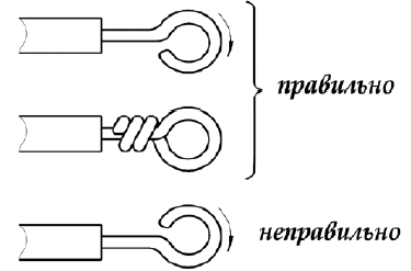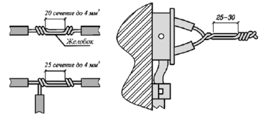 Оконцевание алюминиевых жил под винтовой зажим выполняется в виде кольца, для медных жил - в виде кольца и стержня. Последовательность присоединения алюминиевых жил сечением до 10 мм: 1) с конца жилы снимают изоляцию на длине, достаточной для выполнения кольца. Нож направляют под углом 10-15° к поверхности провода, чтобы, срезая изоляцию, он скользил по поверхности жилы. Нельзя держать нож перпендикулярно проводу, так как в этом случае можно надрезать и надломить жилу. Для снятия изоляции с проводов сечением до 4 мм применяют специальные клещи КСИ; 2) жилу зачищают наждачной или стеклянной бумагой до металлического блеска и смазывают тонким слоем кварцевазелиновой пасты; 3) подготовленный конец жилы загибают круглогубцами в кольцо. Загибать провода следует по часовой стрелке, т. е. по направлению вращения винта. Внутренний диаметр кольца должен быть несколько больше, чем диаметр контактного винта; 4) провод зажимают винтом на пластине контактного вывода, ввертывая его в нарезанное отверстие или затягивая гайкой. Гибкие медные жилы сечением 1-2,5 мм оконцовывают в виде кольца с последующей полудкой в следующем порядке. С провода снимают примерно 25-30 мм изоляции, зачищают жилы наждачной бумагой до металлического блеска, скручивают проволочки в стержень, загибают в кольцо, покрывают кольцо канифолью или ее раствором в спирте, затем окунают на 1-2 с в расплавленный припой П0С-40. После остывания провод изолируют до кольца. Многопроволочную медную токоведущую жилу сечением 1,0-2,5 мм в некоторых видах соединений оконцовывают в виде стержня с полудкой припоем П0С-40. Контактные зажимы штепсельных розеток до 10 А и выключателей от 4 А и выше допускают присоединения медных и алюминиевых проводов сечением от 1 до 2,5 мм, а для выключателей 1 А - только медных жил проводов сечением от 0,5 до 1 мм. Присоединение алюминиевых проводов в зажиме обязательно выполняется с оконце- ванием в виде колечка, медных - в виде колечка и стержнем. Колечко алюминиевого провода перед вводом в контакт зачищают и смазывают кварцевазелиновой или цинковазелиновой пастой. В штепсельных розетках до 10 А к одному контакту можно присоединить не более двух медных или алюминиевых проводов сечением до 4 мм2. Соединение алюминиевых или медных проводов электропроводки с медными проводами осветительной арматуры выполняется с помощью специальной зажимной колодки. Провода зажимаются между пластинами, имеющими насечки и отверстия с резьбой для зажимных винтов. На винты должны быть надеты пружинящие разрезные шайбы.