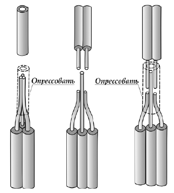 В светильниках патроны для ламп накаливания имеют контактные зажимы под кольцо, а также втычного типа для присоединения прямых концов медных жил проводов. Присоединяя провода, необходимо помнить, что центральный контакт патрона подключается к фазному проводу, а контакт, присоединенный к гильзе цоколя, - к нулевому. Провода, выходящие из патрона, рекомендуется дополнительно изолировать ПВХ- трубкой. Широкое распространение получил способ соединения и оконцевания алюминиевых и медных проводов и кабелей опрессовкой, которая обеспечивает надежный электрический контакт и необходимую механическую прочность, кроме того, проста в исполнении. Опрессовку выполняют ручными клещами, механическими и гидравлическими прессами с помощью сменных матриц и пуансонов. Для соединения жил проводов и кабелей служат гильзы, для оконцевания - наконечники. Технологический порядок опрессовки алюминиевых жил в соединительных гильзах и оконцевание кабельными наконечниками: 1) в зависимости от сечения токоведущих жил проводов и кабелей подбирают тип и размеры соединительных гильз и кабельных наконечников. Для опрессовки жил сечением от 2,5 до 10 мм2 используют соединительные алюминиевые гильзы типа ГАО; для сечений более 10 мм - соединительные гильзы типа ГА. Оконцевание жил и кабелей производят с помощью трубчатых алюминиевых наконечников типа ТА или медноалюминиевых типа ТАМ; 2) подбирают матрицы и пуансоны в соответствии с типоразмерами соединительных гильз и наконечников; 3) проверяют наличие в гильзах и наконечниках заводской смазки. При отсутствии смазки гильзы и наконечники зачищают металлическим "ершиком" и смазывают защитной кварцевазелиновой или цинковазелиновой пастой; 4) снимают с концов жил изоляцию: при оконцевании - на длине, равной длине трубчатой части наконечника, при соединении - на длине, равной половине гильзы; 5) зачищают концы токоведущих жил наждачной бумагой или щеткой из кордоленты до металлического блеска, протирают тканью, смоченной в бензине, и сразу же покрывают кварцевазелиновой пастой; 6) надевают на подготовленные и спрессованные жилы наконечник или гильзу. При оконцевании жилу вводят в наконечник до упора, при соединении - так, чтобы торцы соединяемых жил соприкасались между собой в середине гильзы; 7) устанавливают трубчатую часть наконечника или гильзы в матрицу и опрессовывают; 8) обработав острые края гильз, соединение изолируют. Не разрешается на алюминиевую жилу напрессовывать медный наконечник, так как соединение будет непрочным из-за большой разности коэффициента линейного теплового расширения у меди и алюминия. Порядок опрессовки медных жил и кабелей: с много- и однопроволочных проводов снимают изоляцию на длине 20-25 мм, укладывают соединяемые жилы параллельно, не скручивая их между собой. Затем обворачивают их двумя слоями медной или латунной фольги толщиной 0,2 мм и шириной 18-20 мм и обжимают место соединения пресс-клещами. Опрессовку одно- и многопроволочных жил сечением 4 мм и более выполняют в медных трубчатых наконечниках типа Т или в соединительных медных гильзах типа ГМ. Все операции выполняют в такой же последовательности, как и для алюминиевых проводов и кабелей, за исключением наложения кварцевазелиновой и цинковазелиновой пасты. Запрещается производить опрессовку при помощи молотка и з
