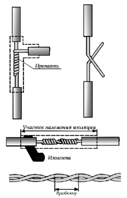 При скрутке провода имеют мало контактных точек и при протекании через соединение тока контакт может перегреваться, что иногда бывает причиной пожара. По этой причине соединение скруткой без пропайки не допускается. Технология соединения и ответвления медных проводов заключается в следующем. Для соединения 2-х кусков провода необходимо плотно скрутить проволочки токопроводящих жил, чтобы они не раскручивались, и скрестить провода. Концом левого провода делают 8-10 оборотов вокруг правого, а концом правого делают 8-10 оборотов вокруг левого провода, но в другом направлении. Места соединения скруткой должны быть длиною не менее 10-15 диаметров соединительных жил. Соединение обжимают плоскогубцами и пропаивают припоем ПОС-30 или ПОС-40. Пропаянную скрутку изолируют на всю длину соединения с обязательным захватом незащищенной изоляции провода. Соединение между собой двух скрученных проводов выполняют вразбежку. При пайке однопроволочных алюминиевых жил сечением 2,5-10 мм соединение и ответвление производят в виде двойной скрутки с желобком (рис. 34). С жил снимают изоляцию, зачищают до металлического блеска наждачной бумагой или кордовой лентой, соединяют внахлестку двойной скруткой с образованием желобка в месте касания жил.