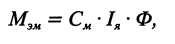 Ток в проводнике направлен от нас. Направление электромагнитного вращающего момента определится по правилу левой руки. Якорь вращается против часовой стрелки. В проводниках якорной обмотки индуцируется ЭДС, направление которой определяется правилом правой руки. Эта ЭДС направлена встречно току якоря, ее называют противо-ЭДС. В установившемся режиме электромагнитный вращающий момент Мэм уравновешивается противодействующим тормозным моментом М2 механизма, приводимого во вращение: