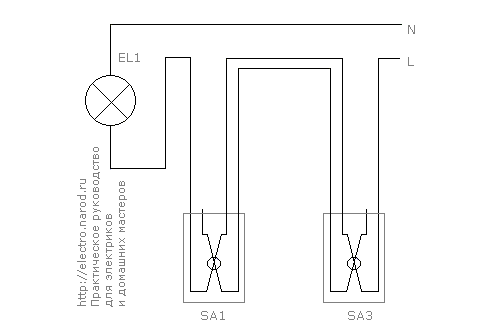 Схема электромонтажа управления освещением с двух сторон, состоит из переключателей на два направления без нулевого положения SA1, SA3, которые при коммутации переключают электропитание с одной управляемой линии на другую и в одном из положении включают и отключают лампу EL1.