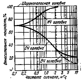 ЭНЦИКЛОПЕДИЯ РАДИОЭЛЕКТРОНИКИ И ЭЛЕКТРОТЕХНИКИ Многополосные акустические системы. Энциклопедия радиоэлектроники и электротехники Энциклопедия радиоэлектроники и электротехники / Акустические системы Высокие требования, предъявляемые к современным громкоговорителям, можно удовлетворить лишь с помощью многополосных акустических систем с двумя, тремя или более динамическими головками, каждая из которых воспроизводит только соответствующую часть спектра подводимого к громкоговорителю широкополосного сигнала. В зависимости от числа полос воспроизведения акустические системы могут быть двух-, трехполосными и т. д. Наибольшее распространение в любительской практике получили двух- и трехполосные акустические системы. Акустические системы с большим числом полос используются профессионалами. Неотъемлемой частью любой многополосной акустической системы являются разделительные фильтры, обеспечивающие подведение к каждой динамической головке только тех частот сигнала, для воспроизведения которых она предназначена. Общее число фильтров равно числу головок. В зависимости от полосы частот, для воспроизведения которых предназначена головка, различают низко-, средне- и высокочастотные динамические головки. Рекомендуемые значения граничных частот разделительных фильтров 500 Гц, 1, 2, 3, 4, 8 кГц. Выбор значений граничных частот разделения полос зависит от частотных свойств динамических головок и значений их номинальной мощности. На рис. 1 приведены кривые мощностей низко-, средне- и высокочастотных головок в зависимости от граничной частоты разделения полос по отношению к мощности широкополосной головки, способной воспроизвести мощность, равную выходной мощности УНЧ, для совместной работы с которым предназначена многополосная акустическая система. Штриховой линией обозначена мощность высокочастотной головки трехполосной системы.