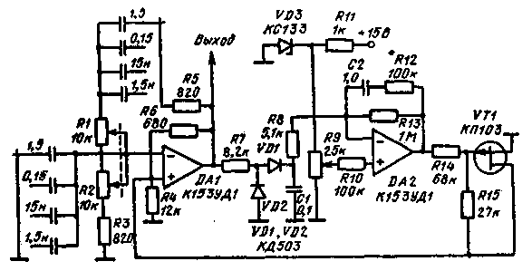 Генератор (рис.3) собран на полевом транзисторе VT1 с двойным Т-образным мостом в цепи ОС. Для стабилизации амплитуды выходного сигнала в коллекторах транзисторов VT2 и VT3 колебания выпрямляются детектором, собранным на элементах С6, С7, VD1, VD2. На выходе детектора формируется постоянное напряжение положительной полярности. Когда колебания в генераторе отсутствуют, через резистор R11 протекает ток, открывающий транзистор УТ4.