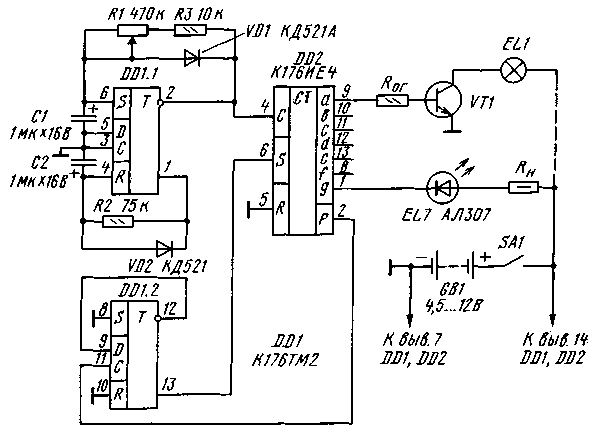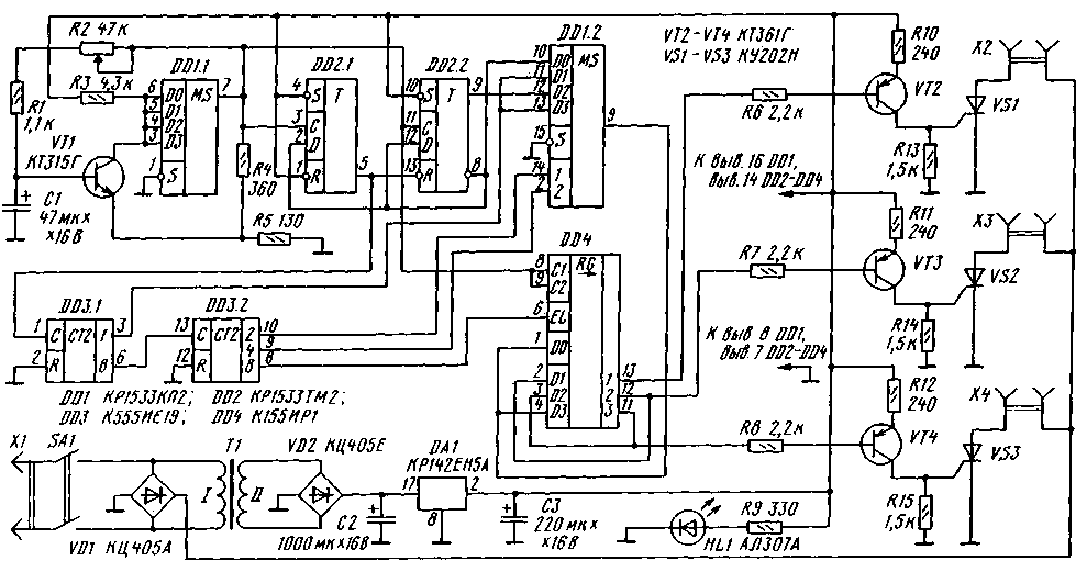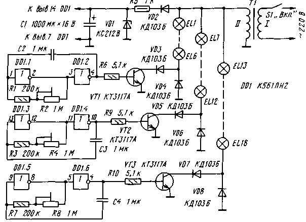 ЭНЦИКЛОПЕДИЯ РАДИОЭЛЕКТРОНИКИ И ЭЛЕКТРОТЕХНИКИ Новогодние гирлянды. Энциклопедия радиоэлектроники и электротехники Энциклопедия радиоэлектроники и электротехники / Цветомузыкальные установки Приближается один из самых замечательных праздников - Новый год. И, конечно, во многих домах достойное место займет зеленая красавица, на ветвях которой разместятся лампочки разноцветных гирлянд. А чтобы гирлянды переливались всеми цветами радуги, их нужно не только раскрасить, но и подключить к автоматическому переключателю. О некоторых вариантах подобного автомата рассказывается в предлагаемой подборке. Автомат световых эффектов Не всегда удается разместить в комнате большую елку, чаще вместо нее устанавливают небольшую ветку. Наряжают ее в этом случае малогабаритными лампами и светодиодами, которые можно подключить к автомату, выполненному по приведенной на рисунке схеме. По сравнению с устройствами, питающими одну, две или три гирлянды, этот автомат способен управлять семью нагрузками-гирляндами. Причем в качестве гирлянд допустимо использовать единичный источник света - миниатюрную лампу накаливания, например, типа СМ или светодиод серий АЛ 102, АЛ307. При желании нагрузку можно составить из двух-трех последовательно соединенных таких источников. Питается автомат от источника напряжением 4,5...12 В, в качестве которого используется аккумулятор, две последовательно соединенные батареи 3336Л или сетевой блок питания. В автомате использованы две микросхемы. На триггере DD1.1 выполнен генератор импульсов, частоту (и скважность) которого можно изменять переменным резистором R1. Триггер DD1.2 включен по схеме счетного триггера - его инверсный выход (вывод 12) соединен с входом D (вывод 9), а на вход С (вывод 11) поступают импульсы с выхода переполнения Р (вывод 2) счетчика-дешифратора DD2. Прямой выход триггера DD1.2 (вывод 13) подключен к входу S (вывод 6) счетчика-дешифратора DD2. После поступления на вход С счетчика-дешифратора десятого импульса состояние триггера DD1.2 изменяется на противоположное, что вызывает изменение напряжения на выходах a-g счетчика-дешифратора, к которым подключены нагрузки. При использовании малогабаритных ламп их подключают к выходам микросхемы DD2 через согласующий каскад, выполненный на транзисторе, допускающем соответствующий ток коллектора. В цепи базы транзистора обязательно устанавливают ограничительный резистор Rог, сопротивление которого должно обеспечивать насыщение транзистора. В случае использования светодиодов каждый из них нужно подключить через резистор Rн. Конечно, на ветке-елке можно укрепить и миниатюрные лампы, и светодиоды - световой эффект только усилится, особенно при соответствующей окраске ламп и подборе светодиодов разного цвета свечения. Продолжительность свечения гирлянд и пауз между их зажиганием зависит от частоты импульсов, поступающих на счетный вход микросхемы DD2. Плавно эту частоту можно изменять переменным резистором R1, а грубо - подбором конденсаторов С1 и С2. Поскольку частота генератора зависит от общего сопротивления резисторов R1 и R3, а также резистора R2, подключение параллельно им или последовательно с ними (а возможно, и вместо R2 или R3) терморезистора, имеющего тепловой контакт с одной из ламп гирлянд, даст интересный эффект. Теперь длительность состояния выходов счетчика-де
