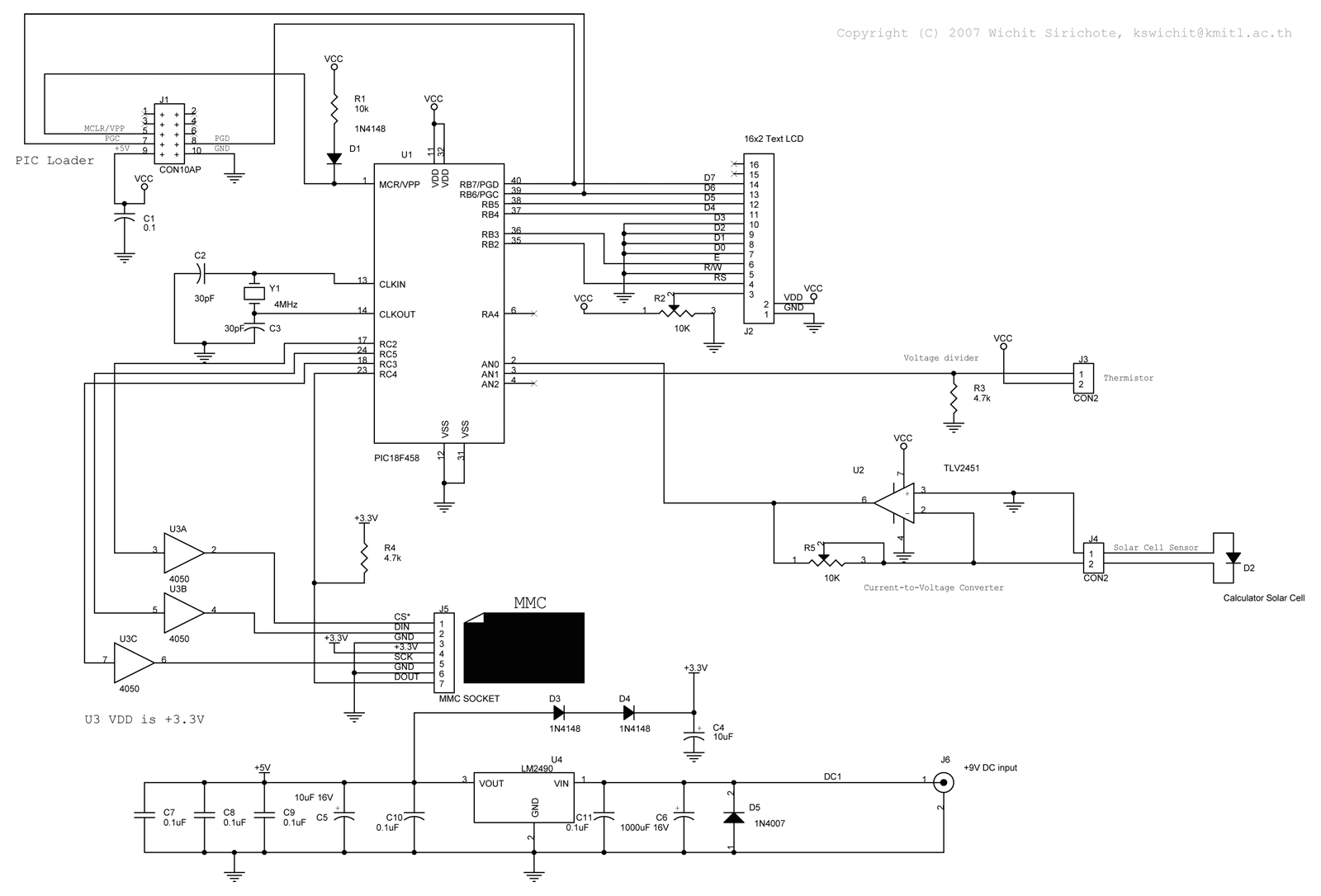 êà÷åñòâå ìèêðîêîíòðîëëåðà èñïîëüçóåòñÿ PIC18F458. Ôëýø-êàðòà: 128 ÌÁàéò Multimedia Memory Card, MMC. Îáìåí äàííûìè ìåæäó PIC è MMC ðåàëèçîâàí ïðè ïîìîùè SPI. Èíòåðâàë èçìåðåíèé - 1 ìèíóòà.  ïðîøèâêå ðåàëèçîâàíî àâòîìàòè÷åñêîå îáíàðóæåíèå MMC-êàðòû, ñîçäàíèå ôàéëà íà íåé è ïîñëåäóþùàÿ çàïèñü äàííûõ â íåãî. Íà LCD-äèñïëåå îòîáðàæàåòñÿ èìÿ ôàéëà, òåêóùèå äàííûå ñîëíå÷íîé ýíåðãèè è äàííûå ÀÖÏ â ðåàëüíîì âðåìåíè.