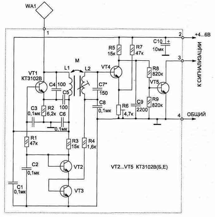 Грубая настройка схемы производится конденсатором С7, плавная - сердечником катушки L2, а также резистором R6. Окончательная настройка устройства проводится с реальным датчиком WA1, с которым схема будет в дальнейшем работать. При этом если охраняемый предмет имеет большую металлическую поверхность, то может потребоваться установка разделительного конденсатора небольшой емкости (5...100 пФ) между WA1 и контактом 1 схемы.