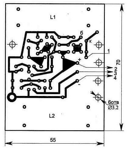 На плате резисторы R1 и R2 располагаются над конденсаторами, что увеличивает плотность монтажа, а конденсатор С10 применен типа К50-16 на 16 В.