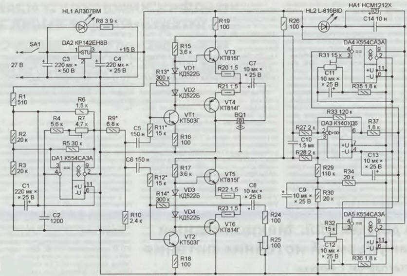 Схема сигнализатора возгорания изображена на рис. 2 Генератор Г собран на компараторе DA1. Его выходной сигнал представляет собой последовательность прямоугольных импульсов скважностью около двух. Конденсатор С2 и резисторы R4, R7 - частотозадающие, подстроечный резистор R7 обеспечивает возможность изменения частоты импульсов. Их амплитуду уменьшает до нужного значения резистивный делитель напряжения R9R10. Конденсатор С1 и резистор R1 образуют фильтр, уменьшающий проникновение в цепи питания сигнализатора импульсных помех, возникающих при работе генератора. На транзисторах VT1, VT3 и VT4 собран усилитель УМ1, а на VT2 VT5 и VT6 - УМ2. Коэффициент усиления напряжения каждого из них задан отношениями сопротивления резисторов соответственно R13 к R1 1 и R14 к R12 Резисторы R15, R17 - нагрузочные первых ступеней соответствующих усилителей. Резисторы R13, R14, R16 R18, R20-R23 стабилизируют режим усилителей по постоянному току. Диоды VD1-VD4 задают напряжение смещения транзисторов VT3-VT6. К выходу УМ1 подключен пьезоакустический преобразователь BQ1 (ПП). Резисторы R24 и R25 образуют эквивалент такого преобразователя (ЭПП) Датчики ДТ1 и ДТ2 представляют собой резисторы R19 и R26, включенные последовательно в цепи питания усилителей мощности. На ОУ DA3 собран ДУ. Резисторами R27- R29, R33 задан его коэффициент усиления Резисторы R30: R34 и конденсатор С9 обеспечивают нормальную работу ОУ при однополярном питании. Конденсатор СЮ уменьшает амплитуду напряжения ультразвуковой частоты между входами ДУ Интегрирующая цепь И образована резистором R37 и конденсатором С13. ПУ1 и ПУ2 собраны соответственно на компараторах DA4 и DA5. Резистивными делителями напряжения R31R35 и R32R36 задают пороги их срабатывания. Конденсаторы С11 и С12 - фильтрующие Узел индикации возгорания состоит из электромагнитного излучателя звука НА1 со встроенным генератором, фильтрующего конденсатора С14 и мигающего светодиода HL2 Интегральный стабилизатор DA2 и фильтрующие конденсаторы C3, С4 образуют источник напряжения +15 В. Светодиод HL1 с резистором R8 - узел индикации включения прибора. Детали сигнализатора смонтированы на макетной плате. Они соединены между собой тонкими изолированными проводами. Чувствительный элемент представляет собой отрезок медного провода диаметром 2 мм и длиной 1,5 м, припаянного одним концом к рабочей поверхности пьезоакустического преобразователя BQ1. Вместо компаратора К554САЗА можно использовать К554САЗБ, К521САЗ, 521 САЗ или их импортный аналог LM311 с различными индексами. ОУ К140УД6 можно заменить на 140УД6А, 140УД6Б, 140УД601А 140УД601Б КР140УД6 КР140УД608 и другие ОУ общего применения. Импортные аналоги интегрального стабилизатора КР142ЕН8В - 7815 с различными префиксами и индексами. Транзисторы КТ503Г могут быть заменены транзисторами той же серии или другими с аналогичными параметрами. Транзисторы КТ814Г, КТ815Г можно заменять такими же с другими буквенными индексами или серий КТ816 и КТ817 соответственно. Диоды КД522Б заменяемы другими маломощными импульсными кремниевыми диодами, например из серий КД503, КД521. Светодиод АЛ307ВМ может быть любым другим, a L-816BID - мигающим светодиодом, например, L-796BID В сигнализаторе применены импортные оксидные конденсаторы, но пригодны и отечественные, например, К50-35. Керамические конденсаторы - К10-17а, К10-176 и другие аналогичные. Постоянные резисторы - С2-33 с возможной заменой на С2-23, МЛТ, ОМЯТ Подстро