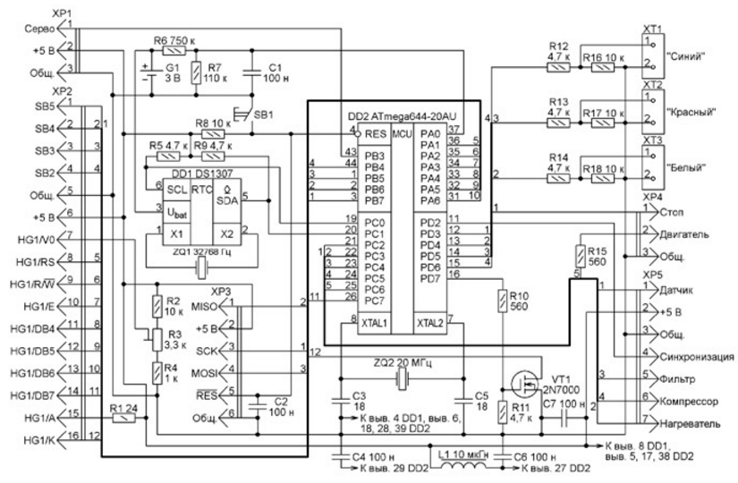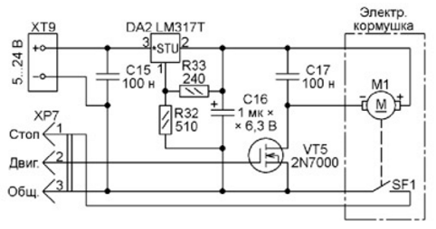 Питание микросхемы часов реального времени DS1307 (DD1) резервировано с помощью литиевого элемента G1, который обеспечивает ход часов при выключенном основном питании. С микроконтроллером эта микросхема связана по интерфейсу I2C. Для контроля состояния элемента G1 часть его напряжения через резистивный делитель R6R7 поступает на вывод 37 микроконтроллера - вход встроенного в него АЦП. Микроконтроллер DD2 ATmega644 работает с кварцевым резонатором ZQ2 частотой 20 МГц. Резистор R8 и конденсатор C2 образуют цепь начальной установки микроконтроллера в исходное состояние. Для перевода его в это состояние в случае сбоя программы служит кнопка SB1. L1C6 - фильтр питания АЦП микроконтроллера. Разъем XP3 предназначен для соединения микроконтроллера с программатором. Конфигурацию микроконтроллера программируют в соответствии с таблицей. С контактами 1 колодок XT1-XT3 соединяют затворы, а с контактами 2 - истоки не показанных на схеме полевых транзисторов(использовались транзисторы IRLR024N), управляющих светодиодами подсветки аквариума. Разъем XP4 предназначен для подключения по схеме, изображенной на рис. 4, электронной кормушки "Feeder AF2003", приобретенной в интернет-магазине. При выборе кормушки следует обратить внимание, чтобы она была без ЖК-индикатора. Разъем XP1 служит для подключения привода заслонки, имеющейся в крышке аквариума под кормушкой.