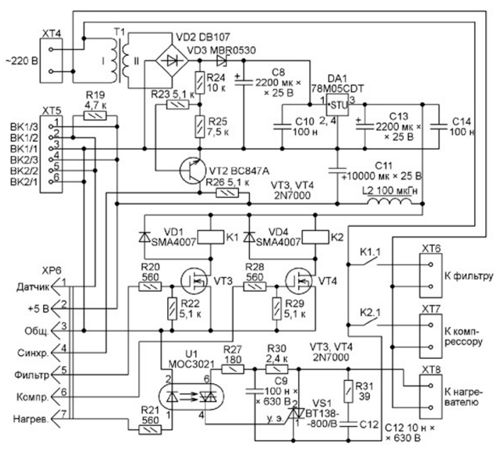 Печатная плата питания и коммутации изображена на рис. 7. Здесь разъем XP6 - IDC-08MS (BH-08). Трансформатор T1 - ТПК-2-6В с вторичным напряжением 6 В при токе 0,4 А. Интегральный стабилизатор 78M05CDT можно заменить любым другим на напряжение 5 В и ток нагрузки не менее 0,5 А. Оба реле - HK4100F-DC5V-SHG, вместо них подойдут и другие реле с обмоткой на 5 В и предельными напряжением и током коммутации, обеспечивающими надежное управление фильтром и компрессором. Конденсаторы C9, C12 - К73-17 или их импортные аналоги.