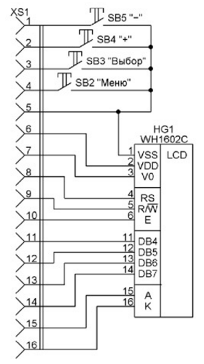 Через разъем XP2, согласно схеме, изображенной на рис. 3, подключены к микроконтроллеру кнопки управления SB2-SB5 и ЖКИ HG1 (две строки по 16 символов). Вместо указанного на схеме ЖКИ WH1602C подойдет MT-16S2D или другой подобный индикатор. Полевой транзистор VT1 по сигналам микроконтроллера управляет яркостью подсветки ЖКИ, а резистор R1 ограничивает максимальный ток подсветки. На резисторах R2-R4 собран делитель напряжения управления контрастностью индикатора.