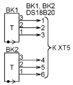 Вся электронная часть из кормушки удалена, оставлены только электродвигатель (M1 на рис. 4) и конечный выключатель SF1. Отслеживая с помощью последнего вращение кормушки, микроконтроллер DD2 формирует сигналы управления полевым транзистором VT5, включающим и выключающим двигатель M1. Напряжение питания двигателя (3 В) стабилизировано интегральным стабилизатором DA2. Ток, потребляемый двигателем, довольно велик, поэтому для его питания необходим отдельный источник, подключаемый к колодке XT9. Я использовал блок питания светодиодного освещения. Разъем XP7 соединяют плоским кабелем с разъемом XP4 на плате управления. Конденсатор C17 подавляет создаваемые двигателем M1 помехи. Напряжение сети 220 В подают на колодку XT4 (см. рис. 2). Пониженное до 6 В трансформатором T1 переменное напряжение выпрямляет диодный мост VD2. Сглаживающий конденсатор C8 отделен от моста диодом VD3, поэтому напряжение на резистивном делителе R24R25 - пульсирующее, от нуля до амплитудного значения. Часть этого напряжения поступает на базу транзистора VT2, в результате транзистор закрывается в моменты близости мгновенного значения сетевого напряжения к нулю. Импульсы частотой 100 Гц с коллектора транзистора VT2 поступают на вход PD2 микроконтроллера. Из сглаженного конденсатором C8 выпрямленного напряжения с помощью стабилизатора DA1 получается стабилизированное напряжение 5 В для питания всех узлов устройства. С выхода PC3 микроконтроллера сигнал поступает на оптосимистор U1, который, в свою очередь, управляет симистором VS1, регулирующим мощность нагревателя воды в аквариуме. Цепь R31C12 подавляет выбросы напряжения на симисторе. К колодке XT8 подключают обогреватель без встроенного термореле. Согласно схеме, показанной на рис. 5, с колодкой XT5 соединяют один или два установленных в аквариуме датчика температуры BK1, BK2. В случае отказа одного из них регулирование температуры продолжается по показаниям оставшегося. При отсутствии или неисправности обоих нагреватель воды отключается, о чем на индикатор выводится сообщение.
