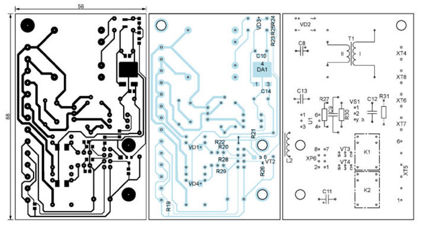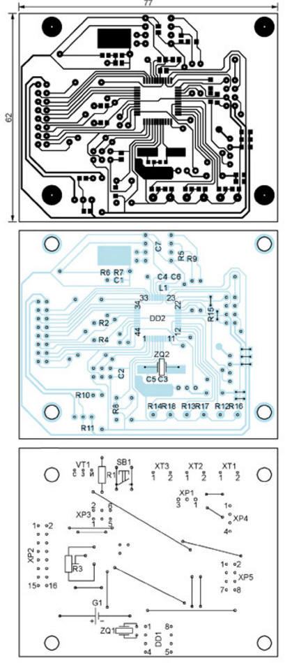 Чертеж печатной платы управления показан на рис. 6. Типы установленных на ней разъемов: XP1 - PLS-3, XP2 - IDC-16MS (BH-16), XP3 - IDC-06MS (BH-06), XP4- WF-04, XP5 - IDC-08MS (BH-08). На плате имеются 12 проволочных перемычек и семь перемычек для поверхностного монтажа. Для литиевого элемента CR2032 (G1) предусмотрен держатель BS-02D-1B.