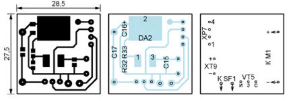Узел управления кормушкой (схема на рис. 4) собран на печатной плате, изображенной на рис. 8. Чертеж платы с кнопками SB2-SB5 не приводится ввиду его простоты.