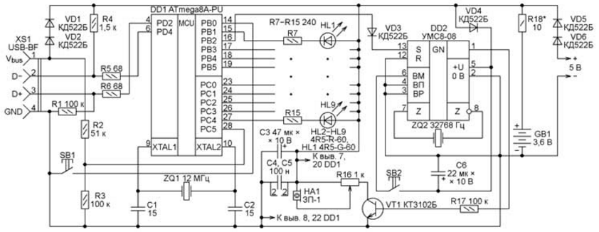 Использованный в сигнализаторе микроконтроллер ATmega8A-PU (DD1) способен работать при пониженном до 2,7 В напряжении питания. Тактовая частота микроконтроллера 12 МГц задана кварцевым резонатором ZQ1. Узел звуковой сигнализации собран на микросхеме музыкального синтезатора УМС8-08 (DD2). Микроконтроллер включает звуковой сигнал, подавая высокий уровень на вход S микросхемы синтезатора. Сигнал непрерывно звучит до нажатия на кнопку SB1. Источником звука служит пьезоизлучатель HA1. Громкость регулируют переменным резистором R16. Мелодии перебирают нажатиями на кнопку SB2 во время воспроизведения. Более подробная информация о микросхемах серии УМС приведена в [1]. В сигнализаторе имеется не показанный на схеме трансформаторный источник стабилизированного напряжения 5 В, собранный по традиционной схеме на интегральном стабилизаторе 7805. В случае пропадания напряжения в питающей сети устройство переходит на питание от аккумуляторной батареи GB1. Средний ток, потребляемый от нее, не превышает 5 мА. При наличии напряжения в сети батарея непрерывно подзаряжается благодаря цепи VD5, VD6, R18. Однако рекомендуется раз в месяц ее отключать и производить полный цикл разрядки до напряжения 3 В и зарядки с помощью внешнего зарядного устройства. Микросхему музыкального синтезатора УМС8-08 можно заменить другой из серий УМС7 и УМС8. Они различаются лишь набором мелодий. Транзистор КТ3102Б допустимо заменить на КТ3102Г, КТ3102Е или импортный BC547, а также на КТ315Б или КТ315Г, если уменьшить сопротивление резистора R17 до 51 кОм. Вместо диодов КД522Б подойдут КД521А, КД521Б, КД522А, 1N4148 и аналогичные. Все постоянные резисторы - С2-33Н или МЛТ. Оксидные конденсаторы С3 и C6 - К50-83, К50-16 или импортные. Остальные конденсаторы - керамические К10-73-1б, К10-17в. Светодиоды пригодны любые в корпусах диаметром 5 мм желаемого цвета свечения. В авторском варианте в качестве HL1 установлен светодиод зеленого цвета свечения, чтобы не беспокоить больного попусту, остальные - красного цвета. Разъем XS1 - розетка USB-BF. Аккумуляторная батарея GB1 составлена из трех Ni-Mh аккумуляторов типоразмера AA емкостью 80о мА·ч. Можно использовать аккумуляторы и другой емкости, но при этом желательно подобрать резистор R18 такого сопротивления, чтобы начальный ток зарядки разряженной до напряжения 3 В батареи был численно равен 0,1 ее номинальной емкости. Сигнализатор собран на стандартной перфорированной монтажной плате размерами 70x50 мм с шагом перфорации 2,54 мм. Способ монтажа - навесной с фиксацией термоклеем. Ввиду простоты схемы печатный монтаж не применялся. Все элементы устройства, кроме светодиодов HL2-HL9, размещены в пластмассовой электротехнической распределительной коробке исполнения IP67 размерами 80x80x40 мм. Разъем XS1 расположен на небольшой печатной плате, напротив него в стенке коробки вырезано отверстие соответствующих размеров. Элементы HA1, HL1, GB1, R16, SB1 зафиксированы на крышке коробки термоклеем. Кнопка SB2, не относящаяся к органам оперативного управления, находится на монтажной плате. На рис. 3 показано взаимное расположение монтажной платы и выносных элементов внутри распределительной коробки.