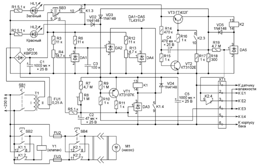 Питается блок управления от сети переменного тока напряжением 230 В, включают его кнопочным выключателем SB1. С помощью трансформатора T1, диодного моста VD1 и сглаживающего конденсатора C1 из вторичного переменного напряжения 8,5 В получено постоянное напряжение (12 В при номинальном напряжении в сети). Оно поступает на узел контроля напряжения, собранный на микросхемах DA1, DA2, DA4. Идея этого узла найдена в [4]. Кроме того, выпрямленное напряжение через контакты кнопки SB3 и нормально замкнутые контакты реле K1.3 поступает на узел, собранный на транзисторах VT2 и VT3 согласно рекомендациям, имеющимся в [5]. Он генерирует импульсы амплитудой 12 В, длительность которых задана емкостью конденсатора C4 и сопротивлением резистора R15, а период следования - емкостью того же конденсатора и сопротивлением резистора R14. Импульсы питают узел, собранный на микросхемах DA3 и DA5, транзисторе VT1 и реле K1 и K2. К этому узлу подключены электроды датчиков уровня Е1-Е3 и потока Е4, а также датчики влажности. Напряжение между электродами датчиков Е1-Е4 и корпусом накопительного бака - около 12 В, причем оно импульсное и приложено к электродам только во время определения уровня воды в баке. Состояние микросхемы DA5 в течение импульса зависит от наличия и сопротивления воды между датчиком нижнего уровня (электродом Е2) и корпусом бака. Если воды в накопительном баке нет или ее уровень ниже электрода Е2, микросхема DA5 открывается (замыкает свою цепь анод-катод) и включает реле K2. Контакты K2.1 и K2.2 подают напряжение сети на водяной насос M1. Контакты K2.3, замкнувшись, останавливают генерацию импульсов. Напряжение на коллекторе транзистора VT3 становится постоянным (около 12 В). Контакты K2.4 отключают электрод Е2. После наполнения бака и замыкания водой электрода E1 (датчика верхнего уровня) и корпуса бака происходит выключение микросхемы DA5 и реле K2. Насос M1 останавливается, подача воды в бак прекращается. Узлы, собранные на микросхемах DA1, DA2, DA4 и на микросхеме DA3, транзисторе VT1 и реле K1, предназначены для отключения насоса M1 в аварийных ситуациях, сигнализации об этом и удержания блока управления в режиме "авария". Индикаторами рабочего и аварийного режимов служат соответственно светодиоды HL1 и HL2. Насос выключается, прекращая подачу воды в накопительный бак, в следующих аварийных ситуациях. Во-первых, при выходе напряжения питающей сети за пределы допуска (±10% номинального значения). Для этого непрерывно контролируется текущее значение нестабилизированного выпрямленного напряжения на конденсаторе C1, пропорционального напряжению в сети. Микросхема DA1 закрывается, а DA2 открывается, когда это напряжение ниже нижнего порога, установленного подстроечным резистором R4. Микросхема DA4 открывается при превышении выпрямленным напряжением верхнего порога, установленного подстроечным резистором R13. В обоих случаях срабатывает и самоблокируется K1 - реле аварийного отключения и сигнализации об аварии. Второй аварийный режим возникает при неисправности насоса или в случае, когда насос работает, но вода в бак не поступает по причине, например, ее отсутствия в источнике или повреждения трубопровода. Когда струя поступающей в бак воды, в которой находится электрод Е4, электрически не соединяет его с корпусом бака, происходит зарядка конденсатора C2. По достижении напряжением на конденсаторе порогового