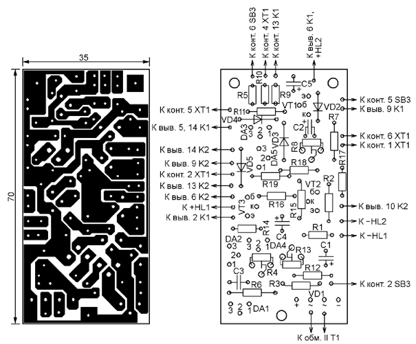 Налаживание собранного блока управления начинают с проверки постоянного напряжения на конденсаторе C1 и наличия импульсов на коллекторе транзистора VT3. Опытным путем определяют продолжительность слива воды из бака от электрода Е1 до электрода Е2. Затем устанавливают такой же продолжительность паузы между импульсами, уменьшая или увеличивая емкость конденсатора C4 и сопротивление резистора R14. Для указанных на схеме номиналов длительность импульса - около 5 с, а паузы между импульсами - 1 мин. Налаживание заканчивают установкой верхнего и нижнего порогов в узле контроля сетевого напряжения. Для этого удобно применить лабораторный регулируемый автотрансформатор (ЛАТР). Работу выполняют в следующем порядке. Электрод датчика потока Е4 соединяют перемычкой с общим проводом блока (контактами 1 и 6 колодки XT1). Выводы контактов реле K2.4 также соединяют перемычкой. Движок подстроечного резистора R4 устанавливают в верхнее, а движок подстроечного резистора R13 - в нижнее по схеме положение. С помощью ЛАТР устанавливают подаваемое на первичную обмотку трансформатора T1 напряжение равным 230 В. Не торопясь, снижают напряжение на этой обмотке, устанавливая его равным 207 В. Движок подстроечного резистора R4 медленно перемещают вниз (по схеме), пока не сработает реле K1. Увеличивают до 230 В напряжение, снимаемое с ЛАТР, и нажатием на кнопку SB3 отменяют режим "Авария". Теперь с помощью ЛАТР повышают напряжение до 253 В. Сделав это, движок подстроечного резистора R13 медленно перемещают вверх (по схеме), вновь добиваясь срабатывания реле K1. Выключив питание блока, снимают перемычку, соединяющую электрод Е4 с общим проводом. Далее проверяют работу датчика потока Е4. Для этого отключают насос и отсоединяют электроды Е1 и Е2 от управляющего входа микросхемы DA5. Через 20...40 с после включения блока в сеть реле K1 должно сработать. Затем блок выключают, снимают перемычку с контактов К2.4 и подключают датчики Е1 и Е2. После этого проверяют работу датчика влажности, прикладывая влажную ткань к оголенным участкам его проводов. При обустройстве системы водоснабжения следует учитывать температурный фактор. Трубы, подводящие воду от источника, должны быть прямыми и иметь постоянный уклон 20...30 мм на метр длины в сторону источника воды. Это исключит замерзание воды в трубах, поскольку после остановки центробежного насоса она стечет через насос обратно в источник. Накопительный бак должен быть установлен выше всех потребителей в отапливаемом помещении или на чердаке (где теплоизолирован вместе с дымоходом). Блок управления системой водоснабжения устанавливают в любом удобном месте. Может оказаться полезной замена светодиода HL2 пьезоизлучателем звука с встроенным генератором, например КРЕ-842. В этом случае резистор R2 рекомендуется заменить любым выключателем, чтобы иметь возможность отключать звуковой сигнал аварии. Литература