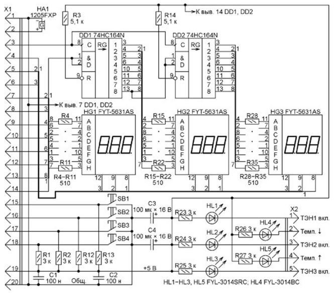 Цепь управления двигателем M2, приводящим в движение водяной насос, в которую входят автомат SA2 и один из каналов симисторного модуля, отличается лишь тем, что ее размыкание контактором KM1 не предусмотрено. Это необходимо, чтобы в случае аварийного отключения нагревателей насос продолжил работать, обеспечивая циркуляцию воды в системе отопления и ее ускоренное охлаждение. Теплоотводы симисторов, коммутирующих нагреватели и насос, обдувает двухскоростной компьютерный вентилятор M1 типоразмера 80x80x20 мм с напряжением питания 12 В. К модулю симисторных коммутаторов подключены двухцветные светодиоды HL1-HL4. Их кристаллы красного цвета свечения включаются при подаче сетевого напряжения на входы соответствующих симисторных коммутаторов, а зеленые - при открывании их симисторов. В последнем случае цвет свечения светодиода становится желтым, это сигнализирует о том, что на нагреватель или насос сетевое напряжение подано. Диоды VD1-VD8 защищают светодиоды от обратного напряжения. Датчики температуры воды на выходе из котла (BK1), на его входе (BK2), а также температуры воздуха в отапливаемом помещении (BK3) подключены к микроконтроллерному модулю через модуль питания и межмодульных соединений. На выводах датчиков BK1 - BK3 смонтированы детали фильтров (соответственно R1C1, R2C2, R3C3). К выводам 1, 2 датчиков и свободным выводам резисторов припаяны, согласно схеме, провода коротких отрезков стандартных USB-кабелей с вилками разъемов USB-A. В качестве корпусов для датчиков ВК1 и ВК2 использованы стандартные автомобильные датчики температуры охлаждающей жидкости 19-3828, из которых удалены все "внутренности". Датчики DS18B20 вместе с припаянными к ним деталями и концами кабелей вставлены в образовавшиеся полости и залиты автомобильным герметиком. После затвердевания герметика датчик ВК1 ввинчивают на место ранее имевшегося датчика температуры воды на выходе из котла. Диаметр и шаг резьбы подходят. Чтобы установить датчик ВК2, необходимо сделать вставку с резьбовым отверстием в трубопроводе, подводящем воду к котлу. На датчик ВКЗ и конец ведущего к нему кабеля для защиты от внешних воздействий надевают отрезок термоусаживаемой трубки. Этот датчик помещают в удаленном от источников тепла и защищенном от сквозняков месте отапливаемого помещения. С разъемом Х5 модуля питания и межмодульных соединений датчики ВК1-ВКЗ соединены кабелями, сделанными из USB-удлинителей с кабельными розетками USB-A. качестве термовыключателя SF1, сигнализирующего о недопустимом перегреве воды, использован ТМ108 - стандартный автомобильный выключатель вентилятора системы охлаждения двигателя. Место для его установки в котле имеется, шаг и диаметр резьбы подходят. Контакты этого выключателя замыкаются, когда температура воды в котле достигает 92 оС, что приводит к немедленному отпусканию якоря контактором KM1 и выключению всех нагревателей. Размыкаются контакты выключателя SF1 при понижении температуры воды до 87 оС. Для анализа сигналов датчиков и формирования сигналов управления нагревателями и другими устройствами системы применен универсальный микроконтроллерный модуль, описанный в [1], со специально разработанной программой. Чтобы взамен графического ЖКИ подключить к нему светодиодные индикаторы, модуль подвергся небольшой доработке. Удален регулировавший контрастность ЖКИ по