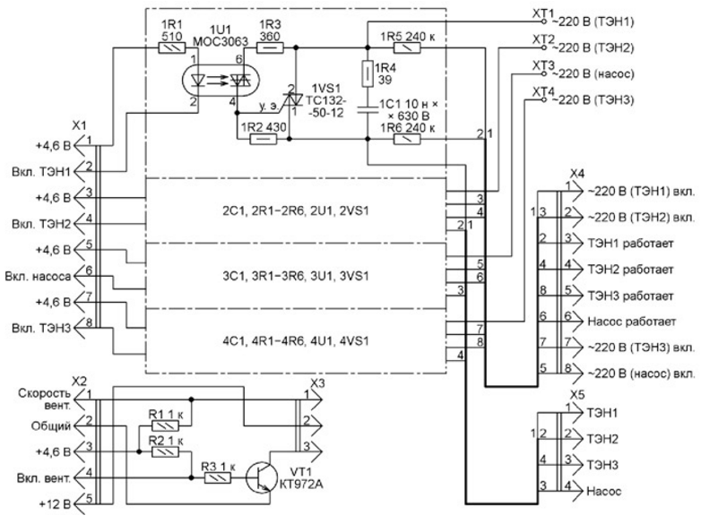 Информацию для отображения на индикаторах HG1-HG3 микроконтроллер формирует в виде последовательного 24-разрядного кода, который три соединенных последовательно восьмиразрядных сдвиговых регистра преобразуют в параллельный код, подаваемый на аноды элементов индикаторов. Первый из этих регистров находится в микроконтроллерном модуле (DD2 по его схеме). Он обслуживает индикатор HG1. Два других (DD1 и DD2 в рассматриваемом модуле индикации) обслуживают соответственно индикаторы HG2 и HG3. Первым в 24-разрядный регистр загружается значение старшего разряда регистра DD2, последним - значение младшего разряда регистра DD2 микроконтроллерного модуля. Светодиоды HL1-HL3 модуля индикации отображают сформированные микроконтроллерным модулем сигналы управления нагревателями, соответственно ЕК1, ЕК2 и ЕКЗ. Светодиод HL4 включается, когда температура воды в котле падает, а HL5 - когда она растет. С помощью кнопок SB1-SB4 переключают режимы работы системы и изменяют их параметры. Схема модуля симисторных коммутаторов представлена на рис. 3. В нем четыре одинаковых канала. Позиционные обозначения элементов каждого из них снабжены префиксами, совпадающими с номерами каналов. Управляющие сигналы, сформированные микроконтроллерным модулем, поступают через разъем X1 на излучающие диоды симисторных оптронов 1U1-4U1, обеспечивающих гальваническую развязку между управляющими и исполнительными цепями.