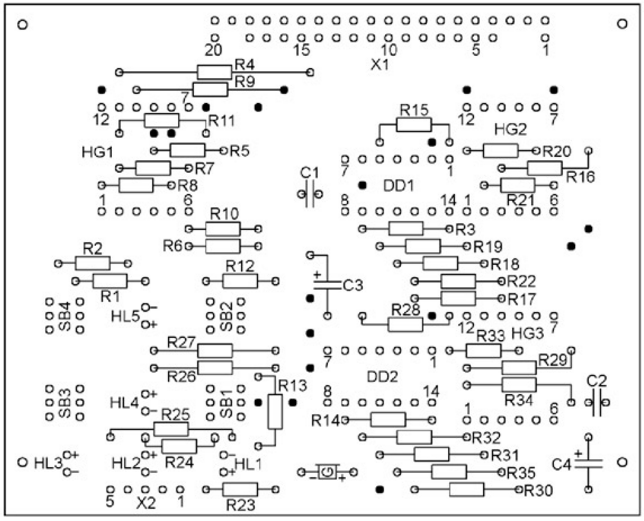Разъем Х3 соединяют с микроконтроллерным модулем, а Х4 - с датчиками температуры. На разъем Х5 выведены сигналы управления нагревателями и насосом, а также питающие напряжения для модуля коммутации. Детали каждого модуля блока управления котлом монтируют на отдельной печатной плате из фольгированного стеклотекстолита толщиной 1,5 мм. Чертеж платы микроконтроллерного модуля имеется в [1]. Подстроечный резистор R15 на ней не устанавливают, а контакты 2 и 18 разъемаX4 соединяют с указанными ранее выводами микроконтроллера перемычками из изолированного провода. Других доработок не требуется. Печатная плата модуля индикации и управления - двусторонняя. Чертеж ее печатных проводников изображен на рис. 5, а расположение деталей - на рис. 6. Если эта плата будет изготавливаться по технологии без сторон короткие отрезки неизолированного провода. Выводы деталей также пропаивают с двух сторон.