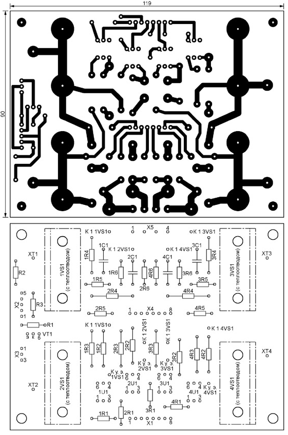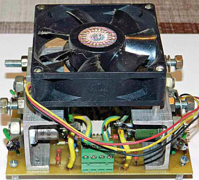 Остальные печатные платы - односторонние. Чертеж платы модуля симисторных коммутаторов показан на рис. 7. Соединения электродов 1 симисторов с контактными площадками на печатной плате выполняют изолированными проводами сечением не менее 2,5 мм2. Вентилятор M1 закреплен на П-образных теплоотводах симисторов 1VS1 - 1VS4 (рис. 8). Для этого в верхних полках теплоотводов сделаны резьбовые отверстия. Чертеж платы модуля питания и межмодульных соединений изображен на рис. 9.