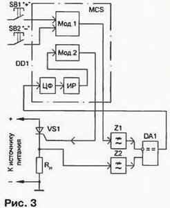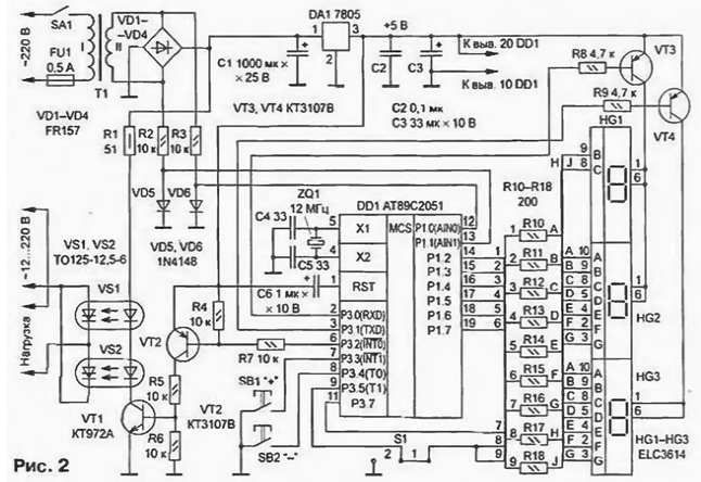 ЭНЦИКЛОПЕДИЯ РАДИОЭЛЕКТРОНИКИ И ЭЛЕКТРОТЕХНИКИ Регуляторы мощности на микроконтроллере. Энциклопедия радиоэлектроники и электротехники Энциклопедия радиоэлектроники и электротехники / Регуляторы мощности, термометры, термостабилизаторы В статье описаны два тиристорных регулятора мощности для инерционной нагрузки. Применение микроконтроллеров позволяет использовать специальный алгоритм равномерного распределения импульсов тока в нагрузке и получить высокую частоту коммутации даже при шаге регулирования мощности 1 %. Первое устройство предназначено для регулирования мощности в нагрузке, рассчитанной на сетевое напряжение. Второе работает с низковольтной нагрузкой, которая гальванически не связана с сетью. Кроме того, этот регулятор обеспечивает стабилизацию мощности в нагрузке при колебаниях сетевого напряжения. Для управления инерционной нагрузкой применяют тиристорные регуляторы мощности, работающие по принципу подачи на нагрузку нескольких полупериодов сетевого напряжения с последующей паузой. Преимущество таких устройств заключается в том, что моменты коммутации тиристоров совпадают с моментами перехода сетевого напряжения через ноль, поэтому уровень радиопомех резко снижен. Кроме того, такой прибор, в отличие от регулятора с фазовым управлением, не содержит аналоговых пороговых элементов, что увеличивает стабильность работы и упрощает налаживание. Поскольку коммутация происходит только во время перехода сетевого напряжения через ноль, минимальная порция энергии, поступающая в нагрузку, равна энергии, потребляемой нагрузкой за один полупериод. Поэтому для уменьшения шага регулирования мощности приходится удлинять повторяющуюся последовательность полупериодов. Например, чтобы получить шаг в 10 %, необходима последовательность из десяти полупериодов. На рис. 1,а показана последовательность импульсов на управляющем электроде тиристора для мощности в нагрузке 30 %. Как видно, тиристор открыт в течение первых трех полупериодов, а в семи последующих закрыт. Далее эта последовательность повторяется. Частота коммутации у такого регулятора для любой мощности, меньшей 100 %, равна 1/10 частоты следования полупериодов. Гораздо логичнее было бы распределить полупериоды, в течение которых тиристор открыт, по возможности, равномерно по всей последовательности [1]. В общем случае задачу равномерного распределения любого числа импульсов N в последовательности длиной М (при N, меньшем или равном М) решает алгоритм Брезенхема. который обычно используют в растровой графике для построения наклонных отрезков. Этот алгоритм реализуется с помощью целочисленной арифметики, что существенно упрощает его программирование. На рис. 1,6 показана последовательность для той же мощности в 30 %. но с применением алгоритма Брезенхема. В последнем случае частота коммутации в три раза выше. Следует отметить, что выигрыш более заметен при малом шаге регулирования мощности. Основа регулятора мощности (рис. 2) - микроконтроллер DD1 АТ89С2051 фирмы ATMEL [2]. Для питания использован маломощный трансформатор ТТ. что вместе с применением оптотиристоров обеспечивает гальваническую развязку от сети. Это делает устройство более электробезопасным. Еще одно полезное свойство регулятора - его можно использовать с нагрузками, рассчитанными на ра