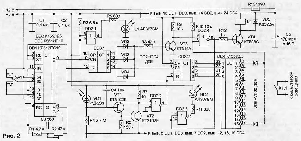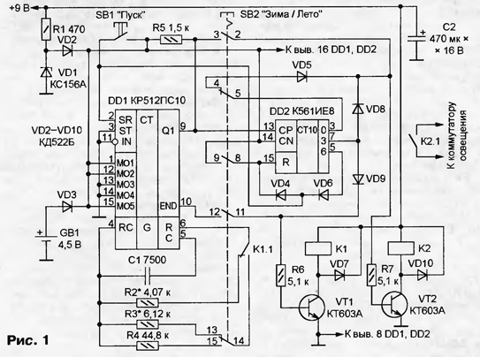 ЭНЦИКЛОПЕДИЯ РАДИОЭЛЕКТРОНИКИ И ЭЛЕКТРОТЕХНИКИ Вечерний свет. Энциклопедия радиоэлектроники и электротехники Энциклопедия радиоэлектроники и электротехники / Освещение Вынесенные в заголовок слова традиционно, начиная с первой публикации на эту тему, относят к устройствам, периодически включающим и выключающим освещение в квартире или на даче, имитируя тем самым присутствие людей. Несмотря на определенные сомнения в эффективности подобной меры защиты от непрошенных гостей и пожарную опасность оставленных без присмотра включенных электроприборов, проблема продолжает волновать многих читателей. Сегодня мы публикуем описания двух автоматов "Вечерний свет", разработанных авторами нашего журнала. Е. ЗУЕВ из с. Денятино Владимирской области считает главным недостатком устройств, опубликованных в [1, 2] то, что они включают освещение один или два раза в сутки на одно и то же время независимо от сезона. Оптимальный, по его мнению, суточный цикл работы автомата в зимнее время: утром на два часа освещение включено, на восемь - выключено, затем на шесть - включено и на восемь - выключено. Летом освещение целесообразно включать ежесуточно на два часа в вечернее время. Если окна охраняемого помещения находятся в тени других строений или растительности, "зимний" цикл может использоваться весь год. Схема автомата показана на рис. 1. Если кнопочный переключатель SB2 находится в указанном на схеме положении, устройство работает в "зимнем" режиме. После подачи питания и нажатия на кнопку SB1 "Пуск" таймер DD1 [3] начнет отсчет времени, а счетчик DD2 будет установлен в состояние, соответствующее лог. 1 на выводе 3. Транзистор VT2 откроется, реле К2 сработает и своими контактами включит освещение. Так как на всех других выходах счетчика DD2 - лог. 0, транзистор VT1 останется закрытым, а контакты реле К 1.1 - в состоянии, показанном на схеме. В частотозадающую цепь тактового генератора таймера DD1 будет включен резистор R2, подобранный таким образом, что период повторения импульсов на выводе 9 DD1 - 4 ч. По истечении половины этого периода (через 2 ч) вместо лог. 1 на выводе 9 DD1 появится лог. 0. В результате состояние счетчика DD2 изменится и лог. 1 с его вывода 3 переместится на вывод 2, не показанный на схеме. Транзистор VT2 закроется, реле К2 разомкнет контакты, освещение погаснет. Через 10 ч после пуска лог. 1, "передвигаясь" каждые 4 ч с одного выхода счетчика DD2 на другой, достигнет его вывода 7. Транзистор VT2 вновь будет открыт, освещение - включено. Одновременно откроется транзистор VT1 и сработает реле К1. Место частотозадающего резистора R2 займет R3, частота колебаний тактового генератора DD1 уменьшится, в результате лог. 0 появится на выводе 9 DD1 лишь спустя 6 ч. В этот момент состояние счетчика DD2 вновь изменится и оба транзистора закроются, выключив освещение и восстановив прежнюю частоту генератора. Еще через 8 ч лог. 1 появится на выводе 5 счетчика DD2. Через диоды VD4 и VD6 она поступит на входы установки таймера и счетчика в исходное состояние, после чего цикл повторится. В "летнем" режиме кнопка SB2 зафиксирована в нажатом состоянии. Счетчик DD2 не действует, так как на его вход R через одну из групп контактов кнопки подана лог. 1, запрещающая счет. Другие группы контактов разрывают цепь, связывающую вывод 3 DD2 с базой транзистора VT2, и соединяют ее с выводом 9 таймера DD1. Сигнал с вывода 9 DD1 чере