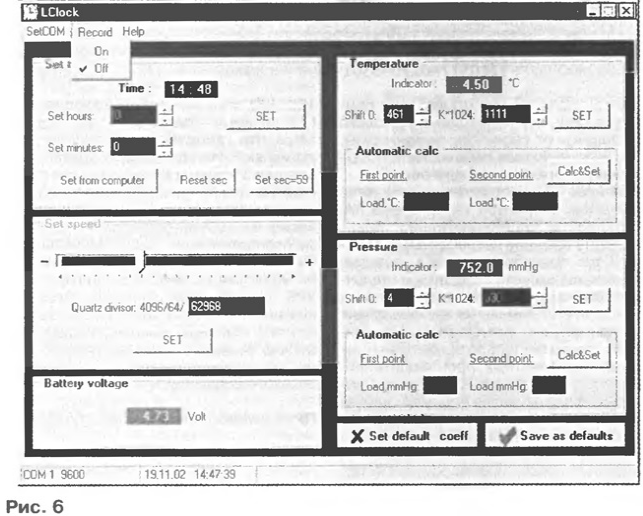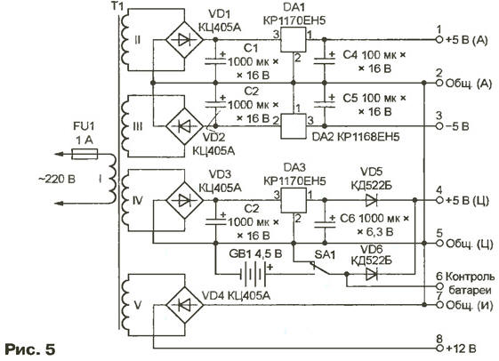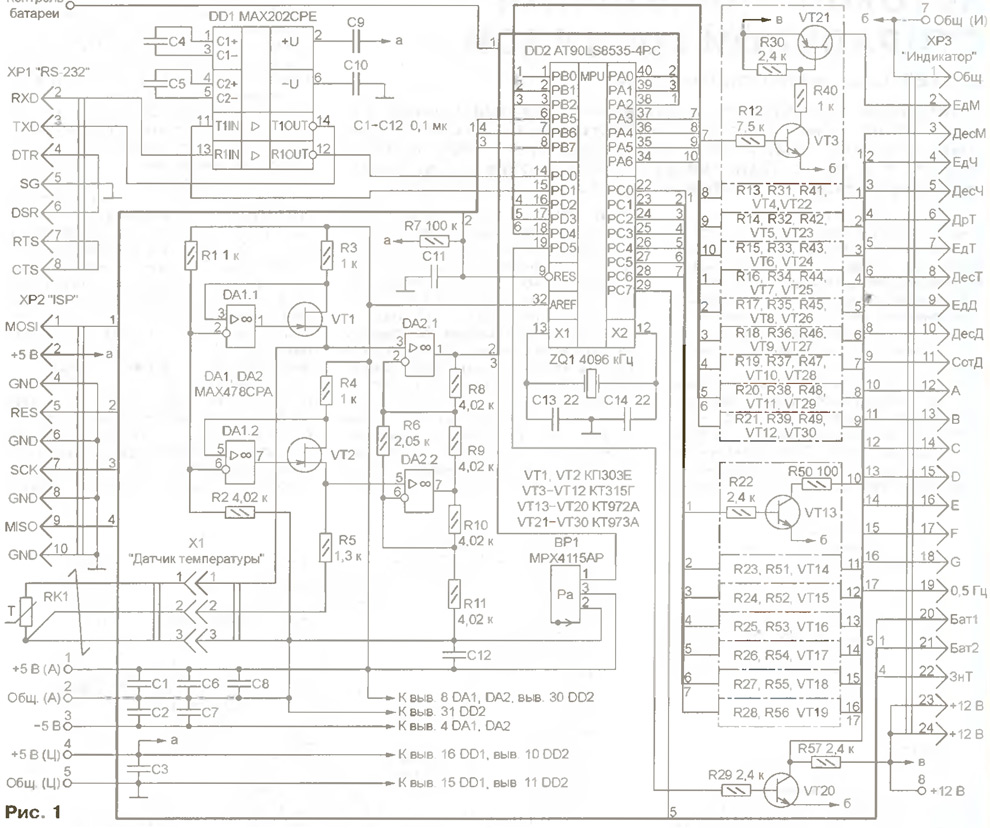 ЭНЦИКЛОПЕДИЯ РАДИОЭЛЕКТРОНИКИ И ЭЛЕКТРОТЕХНИКИ Часы с термометром и барометром. Энциклопедия радиоэлектроники и электротехники Энциклопедия радиоэлектроники и электротехники / Часы, таймеры, реле, коммутаторы нагрузки Предлагаемый прибор построен на микроконтроллере AT90LS8535, показывает не только время, но и температуру, а также атмосферное давление, заменяя таким образом три обычных бытовых прибора. Он может быть связан по последовательному интерфейсу с персональным компьютером, который поможет откалибровать шкалы термометра и барометра, а при необходимости - собрать данные для вывода на экран графиков изменения их показаний за выбранный интервал времени. На светодиодном индикаторе прибора можно наблюдать текущие значения времени в форма е ЧЧ.ММ; температуры в месте установки выносного датчика, °С; атмосферного давления, мм рт. ст. Предусмотрена трехуровневая ('нормально - внимание - разряжена") индикация состояния батареи резервного питания. Температуру в интервале -50...+50 °С прибор измеряет с погрешностью 0,1...0,2 °С. Интервал измерения давления - 700 ..800 мм рт. ст при погрешности 1...2 мм рт. ст. Конструктивно устройство состоит из трех модулей (плат) - контроллера, индикации и питания, помещенных в корпус размерами 210x160x80 мм с прозрачным окном для индикаторов, и выносного датчика температуры, соединяемого с основным блоком трехпроводным кабелем длиной до 20 м. Датчик атмосферного давления находится внутри корпуса. Выбор микроконтроллера AT90LS8535 фирмы Atmel был обусловлен следующими обстоятельствами: