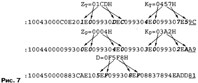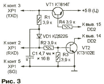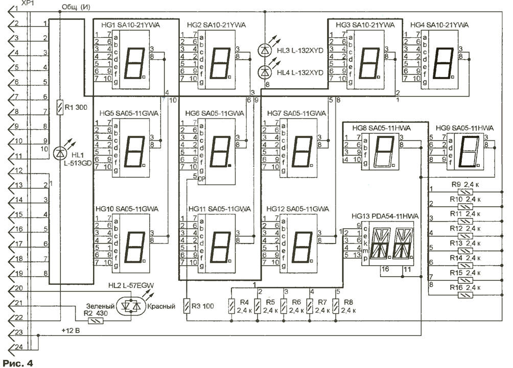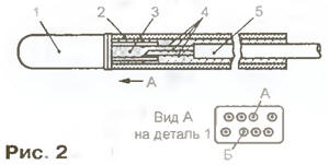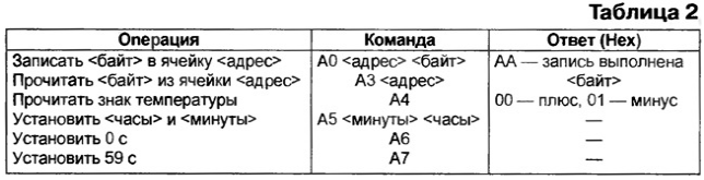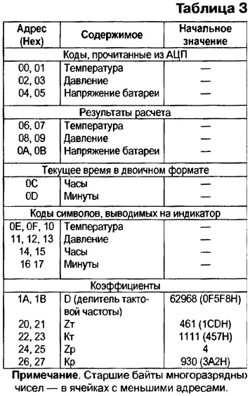 Микроконтроллер AT90LS8535 можно заменить на более современный ATmega8535L или распространенные АТmеgа10З, АТМеgа603 той же фирмы, не изменяя программу. Однако две последние микросхемы значительно дороже и выпускают их только в пленарном 64-выводном корпусе, что потребует существенного усложнения печатной платы. МОДУЛЬ КОНТРОЛЛЕРА В модуле контроллера, схема которого показана на рис. 1, расположены основные узлы прибора: микроконтроллер DD2; преобраэоватвль сигналов UART микроконтроллера в стандартные уровни интерфейса RS-232 (микросхема DD1); узел преобразования сопротивления датчика температуры RK1 в напряжение (микросхемы DAI, DA2, транзисторы VT1, VT2); датчик давления (ВР1); ключи управления светодиодными индикаторами (транзисторы VT3-VT30); вилки интерфейса RS-232 (ХР1), программирования микроконтроллера (ХР2) и для подключения индикаторов (ХР3). Под управлением микроконтроллера DD2 ключи на транзисторах VT3-VT12, VT21 -VT30 поочередно подключают к источнику питания цепи общих анодов десяти семисегментных индикаторов, их катоды коммутируют транзисторы VT13- VT19. Транзистор VT30 управляет парой светодиодов, расположенных между разрядами часов и минут индикатора. С вывода 29 (РС7) микроконтроллера поступает сигнал на светодиод знака "минус" температуры, а с выводов 6 (РВ5) и 7 (РВ6) - на двухцветный светодиод, показывающий состояние батареи резервного питания. Все упомянутые выше индикаторы находятся вне модуля контроллера. Так как выводы 6, 7 микросхемы DD2 используются и для ее программирования эту операцию желательно проводить, отключив от вилки ХРЗ шлейф, связывающий модули контроллера и индикации. Напряжения, пропорциональные измеряемым величинам поступают на три вывода микроконтроллера DD2, запрограммированные как входы трех из восьми имеющихся каналов встроенного АЦП Вывод 40 (PA0/ADC0) температура, 39 (PA1/ADC1) - давление, 38 (PA2/ADC2) - напряжение батареи. Образцовым для АЦП служит поданное на вывод 32 (AREF) микроконтроллера наряжение +5 В А, что значительно снижает требования к стабильности последнего. Дело в том, что выходное напряжение датчиков температуры и давления пропорционально не только измеряемым параметрам, но и напряжению питания. Изменение вместе с ним образцового напряжения устраняет эту зависимость в выходном коде АЦП. Хотя отклонения образцового напряжения от номинала вносят дополнительную погрешность в результат измерения напряжения батареи, в данном случае это не так уж важно. Терморезистором RK1 - датчиком температуры - служит обмотка реле РЭС60 (паспорт РС4.569. 435-00) сопротивлением 1900+120/-380 Ом при 20 °С. Здесь можно применить и другие медные обмотки приблизительно такого же сопротивления, в том числе обмотки реле РЭС49 (паспорт РС4.569.421-00), РЭС79 исполнений ДЛТ4.555.011. ДЛТ4.555.011-05. Сопротивление медного провода обмотки линейно зависит от температуры и достаточно стабильно во времени. Если его величина известна при температуре Т0 (например, при 20 °С), то при температуре Т сопротивление станет равным R(T) = R(T0)[1 +0,004(Т Т0)]. Конструктивное оформление датчика может быть подобным показанному на рис. 2. К выводам А и Б реле 1 припаивают многожильные изолированные соединительные провода 4 (например, МГТФ), пропустив их сквозь трубку-держатель 2 залитую эпоксидной смолой 3. Чтобы предотвратить вытекание жидкой смолы, места неплотного прилегания трубки 2 к реле 1 герметизируют, например, плас